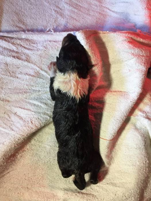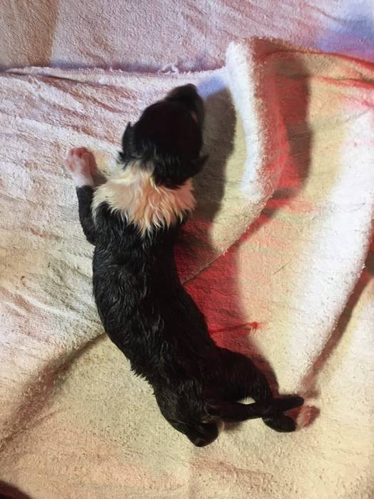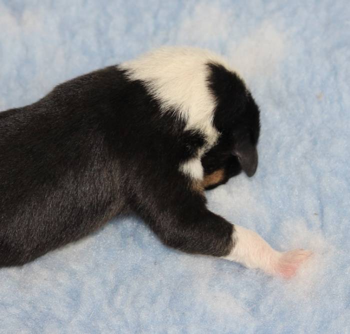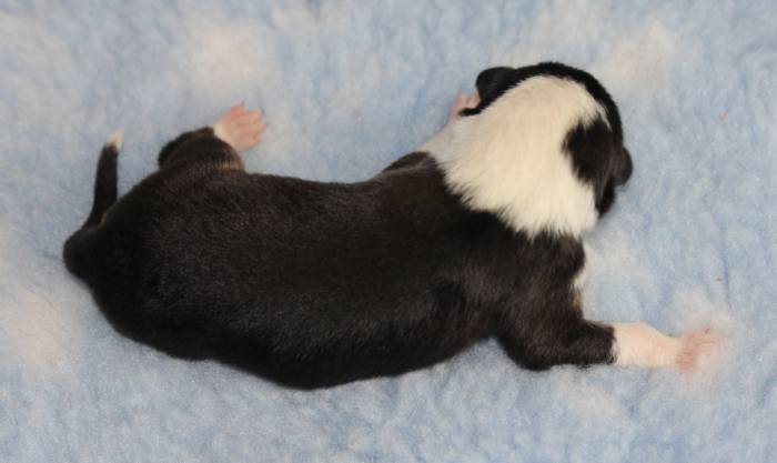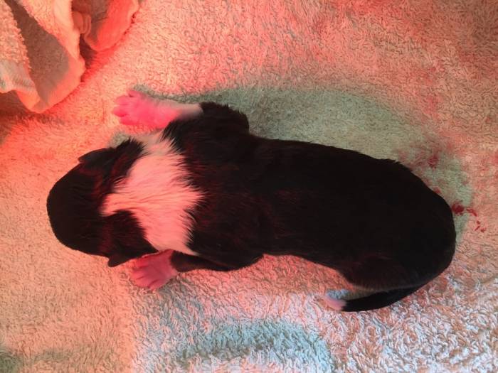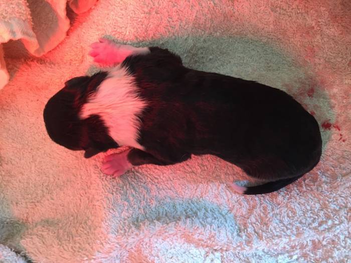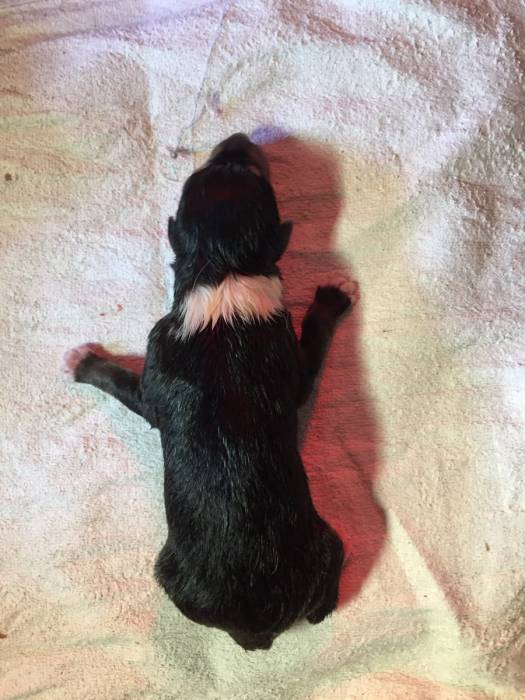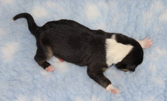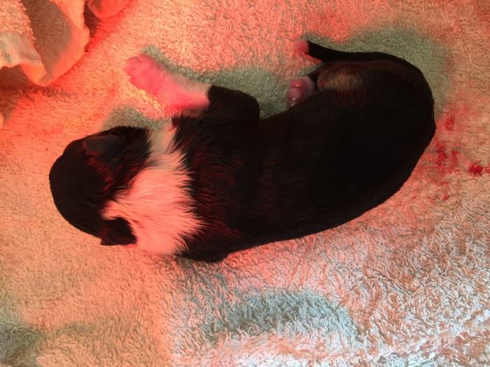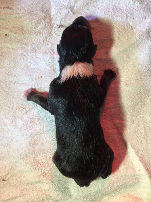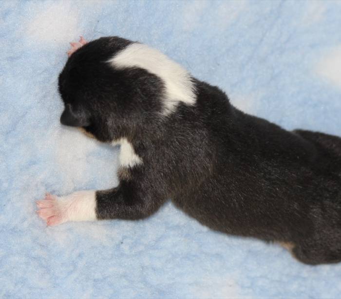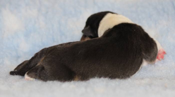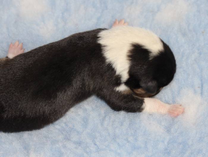 Der letzte Welpe war der leichteste und ist auch eine sehr schöne Hündin. Bei ihrer Geburt ist Mama Bijoux plötzlich aufgestanden. Die Kleine hing kurz in der Luft und ihre Nabelschnur ist abgerissen. Entsprechend empört und aufgeregt war sie, hat sich dann aber schnell anlegen lassen und beruhigt. Sie gleicht der erstgeborenen Hündin sehr stark und ist gar nicht so einfach von ihr zu unterscheiden. Sie hat wie diese links einen breiten, weißen Kragen, rechts ein wenig dünner als die Erstgeborene. Wenn man genau schaut bemerkt man ein paar kleine weiße Haare auf der Stirn. Ihre Füßchen hinten haben recht viel Weiß, aber einen Weißfaktor hat auch sie, wie alle anderen Welpen, nicht. Bei der Schwanzspitze hat sie wohl am lautesten „hier“ geschrien 🙂
