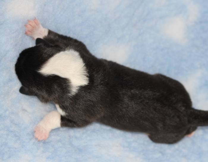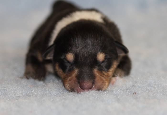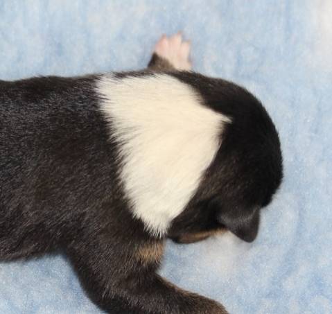 Nach 4 Buben endlich wieder eine Hündin. Und was für eine. Die Einzige die sowas wie eine kleine Blesse auf der Stirn und an der Nase hat. Dazu ein schöner weißer breiter Kragen, weiße Vorderbeinchen, weiße Füßchen hinten, weiße Schwanzspitze und ein helles Gesicht. Ein kleiner Eyecatcher, der jetzt schon sehr süß aussieht.