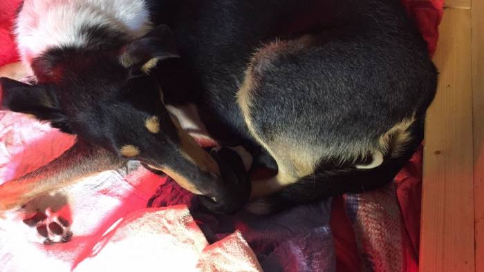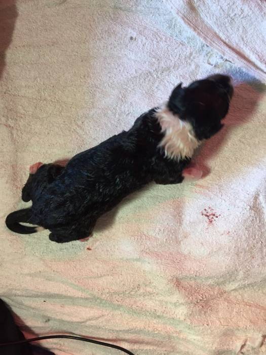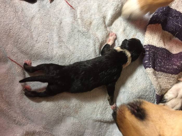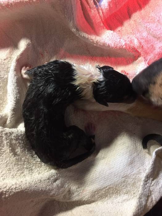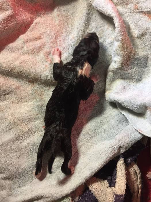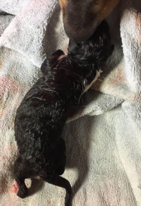 Der leichteste Rüde in der Truppe kam auch mit dem Popo zuerst und brauchte etwas Geburtshilfe.