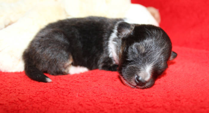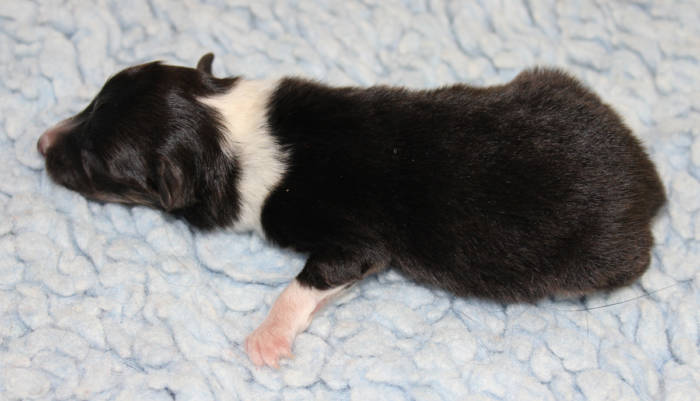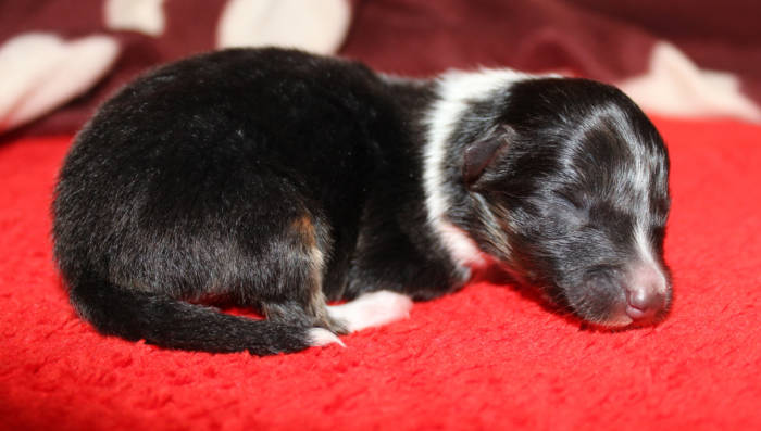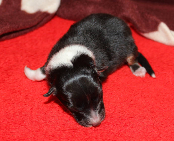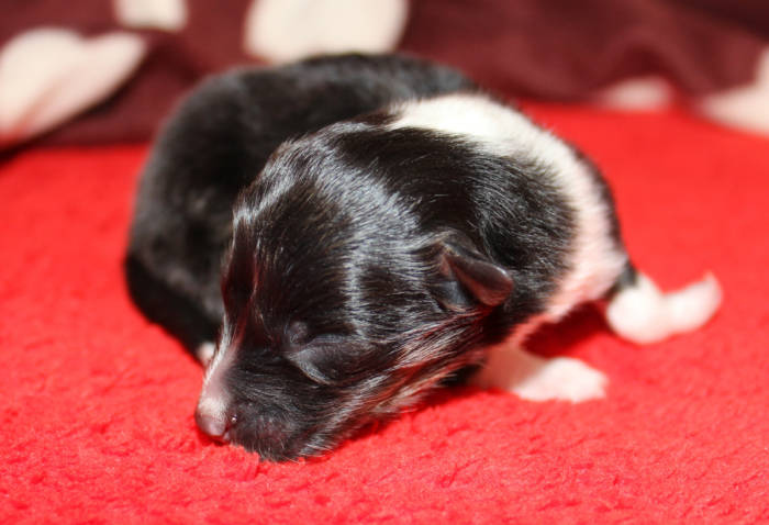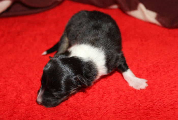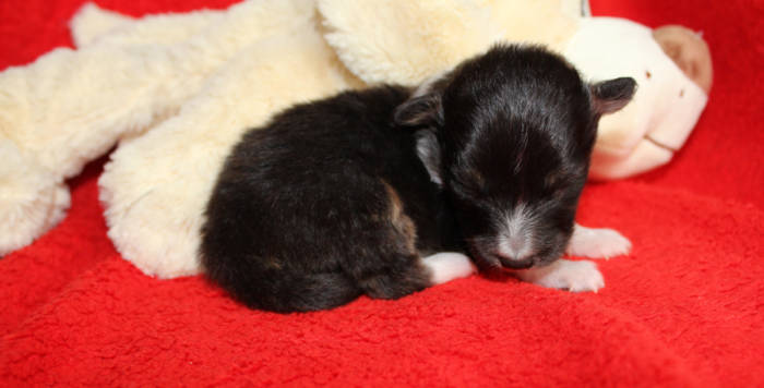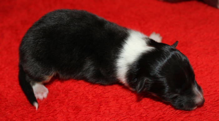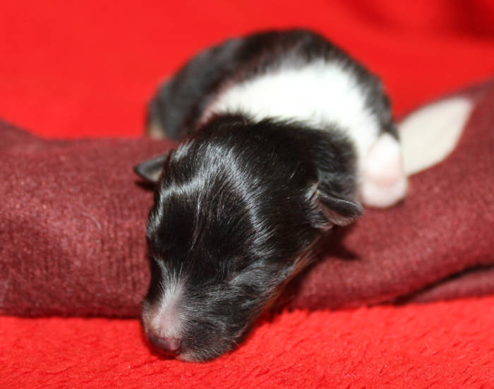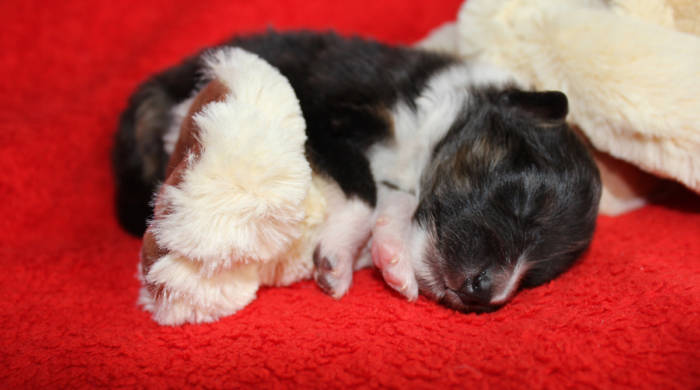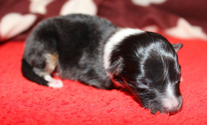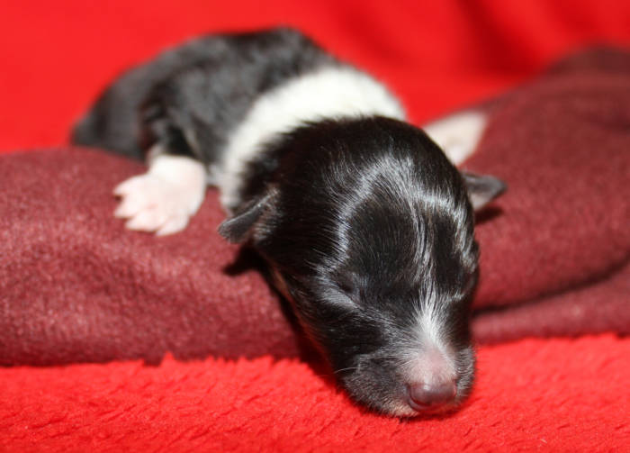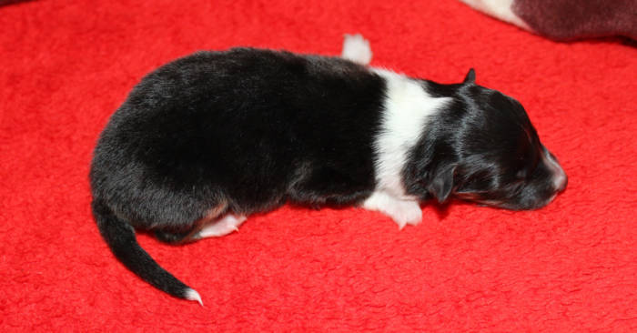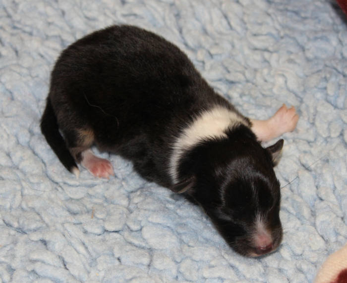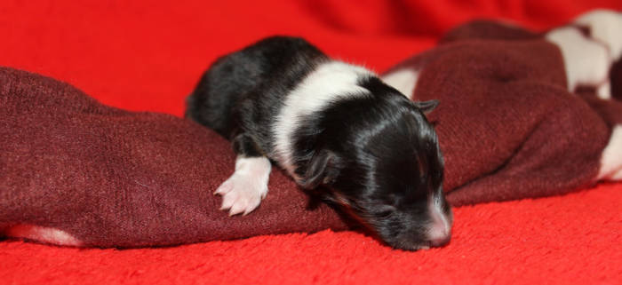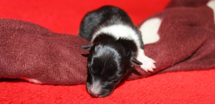 Die beiden folgenden Welpen waren sehr klein und durch die Schwierigkeiten des ersten äußerst mitgenommen. Es waren noch ein Mädchen und ein Junge. Das Mädchen hat sich leider nicht mehr erholt, sondern ist am 2. Tag an dem eingeatmeten Fruchtwasser verstorben.