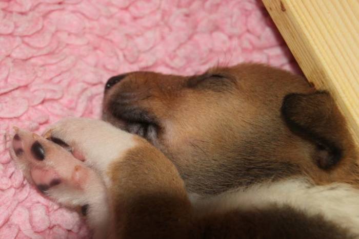Aber am frühen Morgen waren dann alle da und sauber in trockenen Tüchern. Drei süße, lebhafte Welpen, die allesamt sofort bei Mama zu trinken anfingen. Biene ist überglücklich mit ihren Kindern und schon fast zu besorgt. Sie möchte kaum mal nach draußen und selbst das Essen und Trinken muss man ihr in der Wurfbox reichen. Entsprechend gut geht die Entwicklung der Kleinen voran. Es ist kein Sorgenkind dabei und außer dem täglichen Wiegen und Saubermachen gibt es noch nicht viel zu tun.
