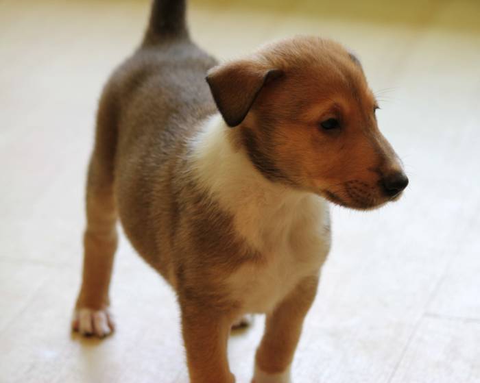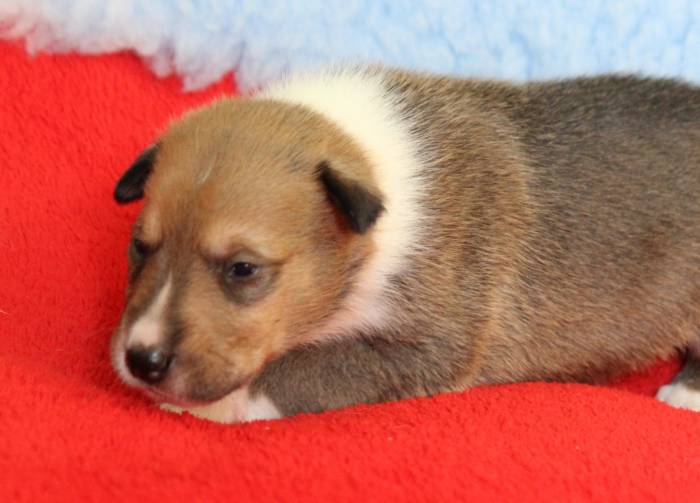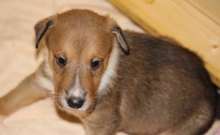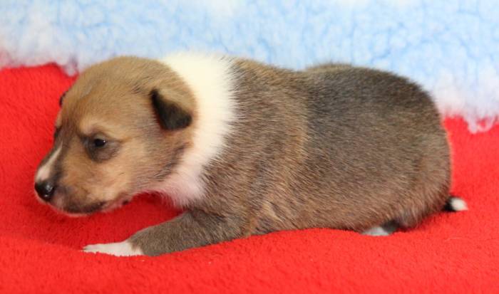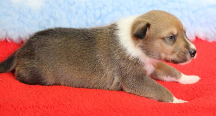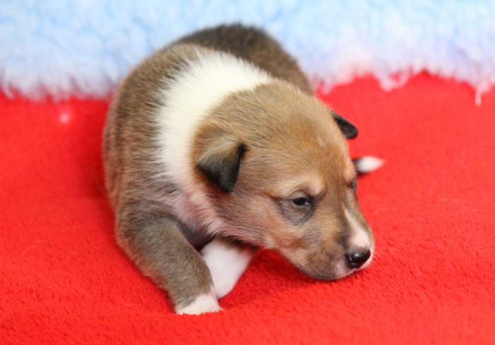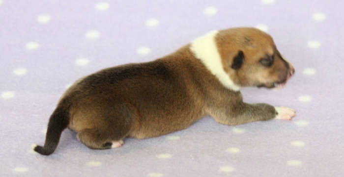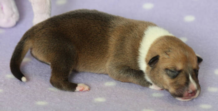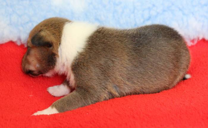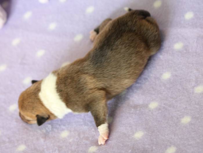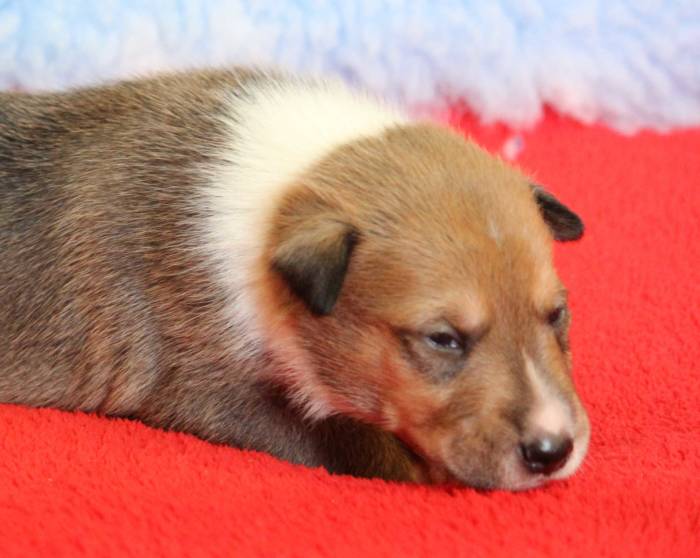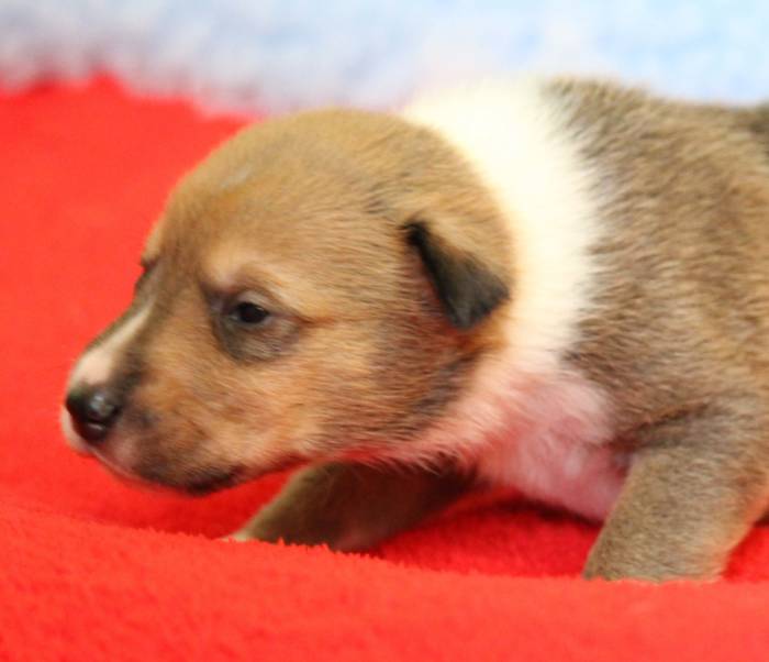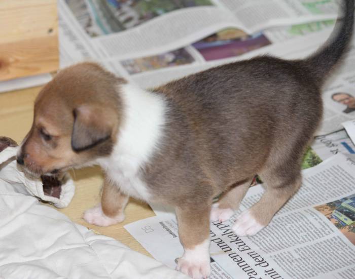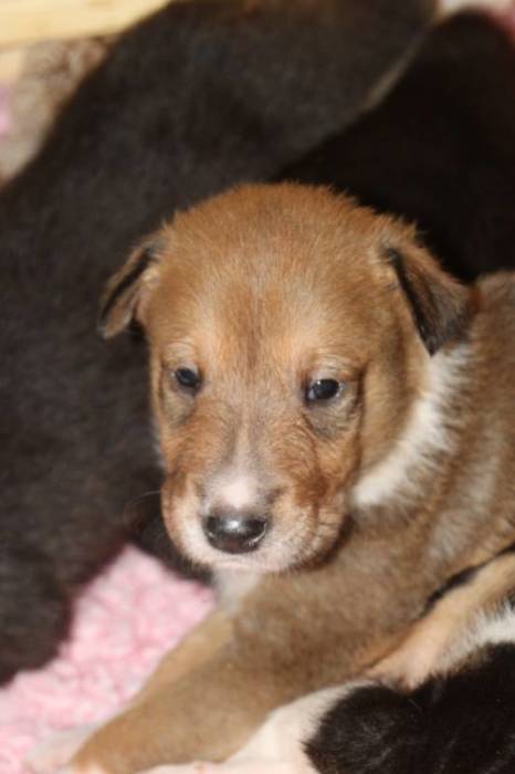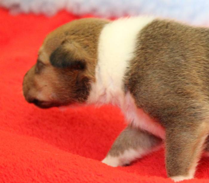 Sehr schöner tricolour Rüde ohne Kragen, aber mit drei weißen Tupfen, als hätte jemand mit einem kleinen Pinselstrich längs über Nase, Stirn und Hals gemalt. Er hat ein sehr schönes Gesicht mit einem jetzt schon schönen roten, abgegrenzten Brand, weiße Füßchen und weißer Schwanzspitze an der schönen langen Rute.