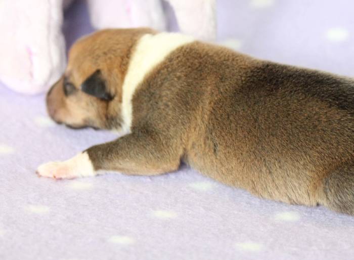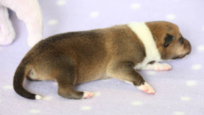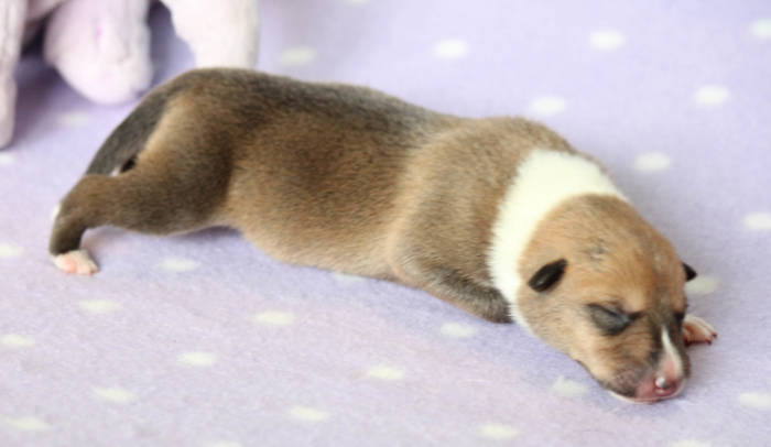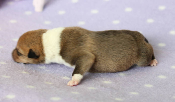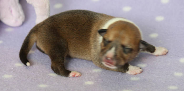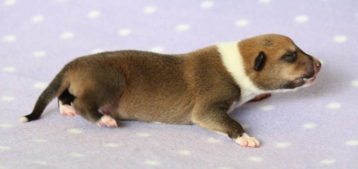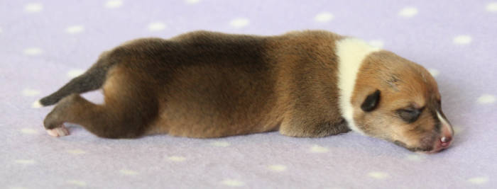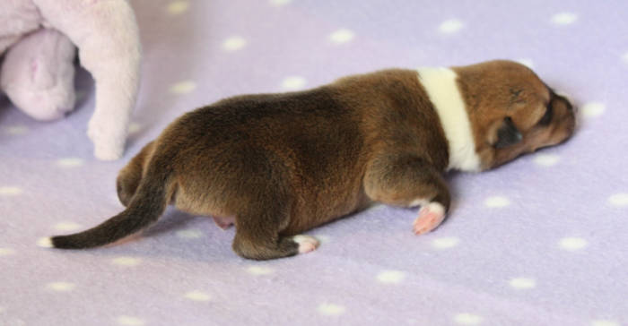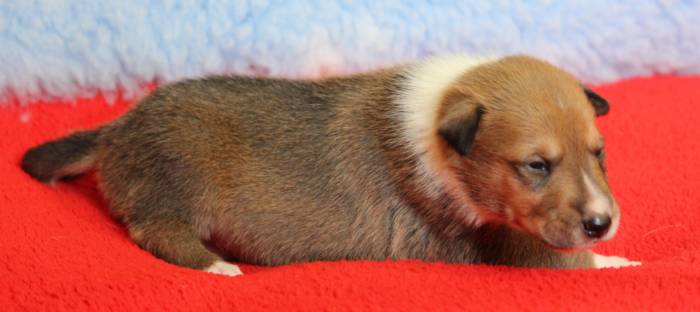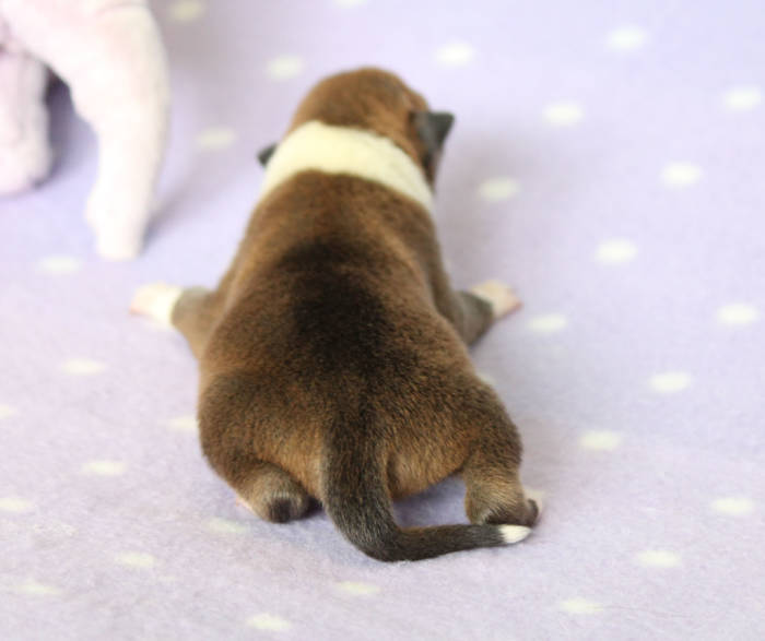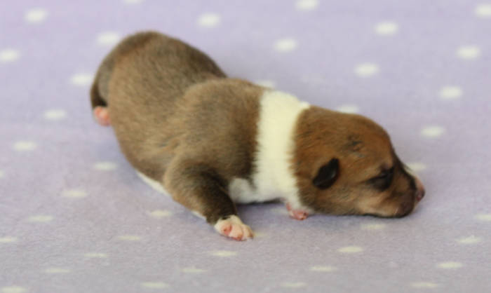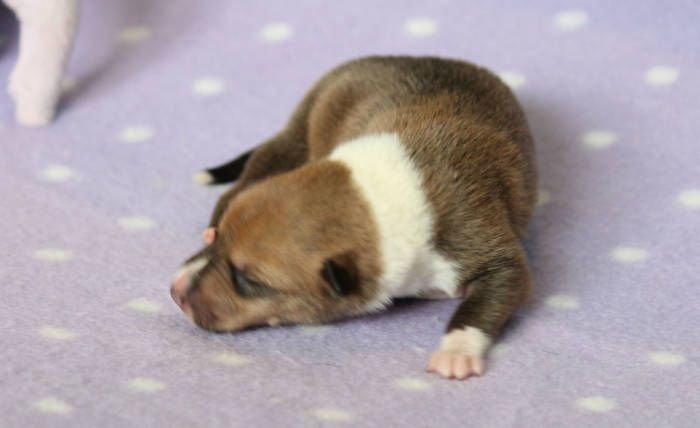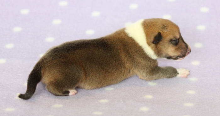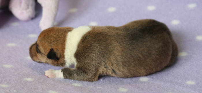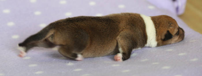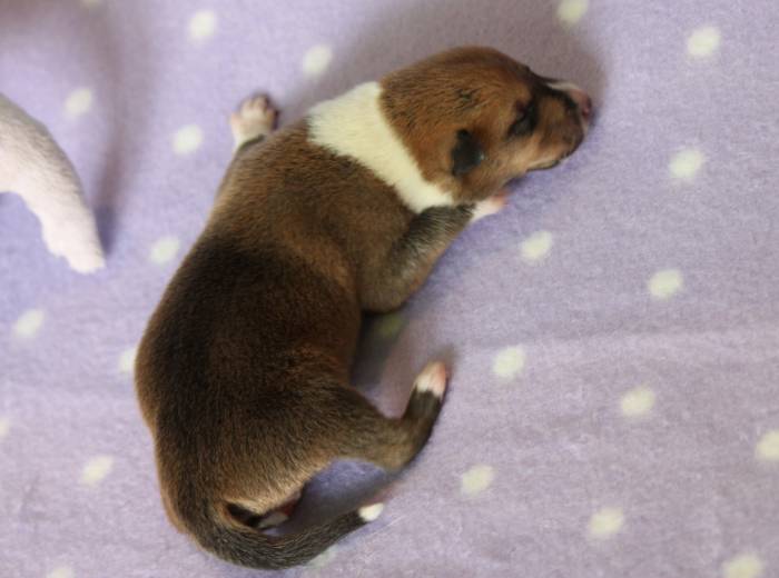 Er ist sehr ruhig und schläft noch viel und nimmt sehr gut an Gewicht zu. Obwohl er kleiner wirkt als sein Brüderchen, hat er diesen im Gewicht überholt. Dennoch ist er im Rücken etwas kürzer als die anderen und wird vermutlich ein wenig kleiner als diese bleiben. Er ist einfach etwas rundlicher als seine Geschwister.