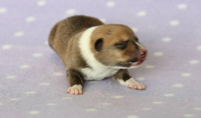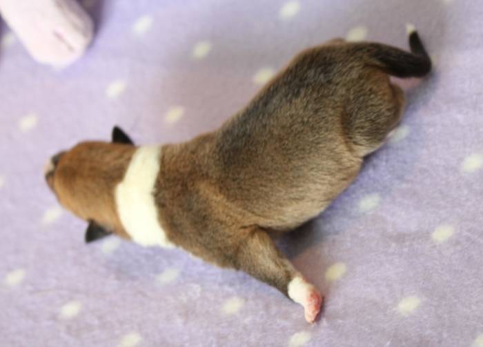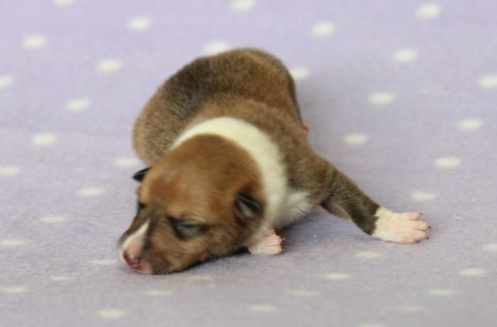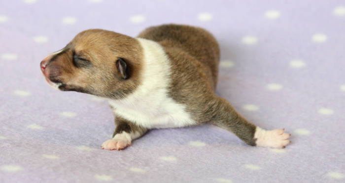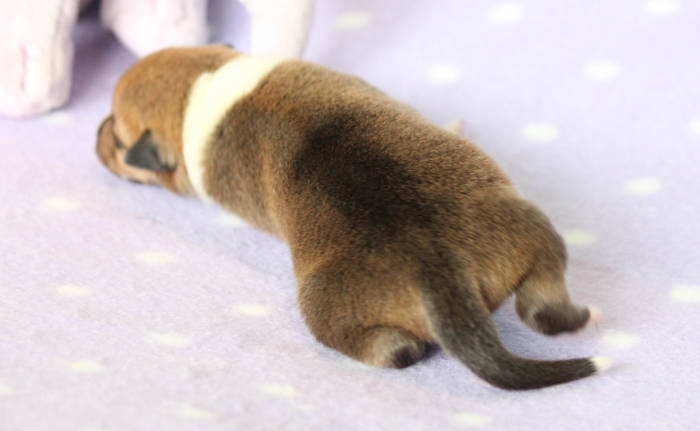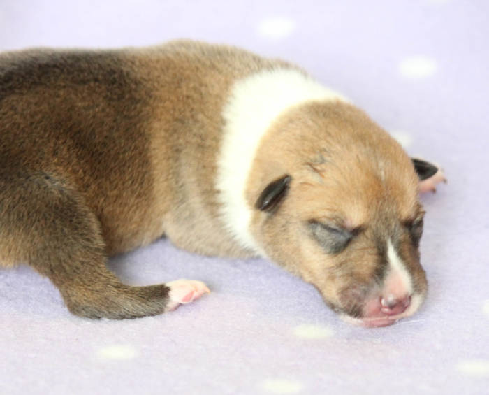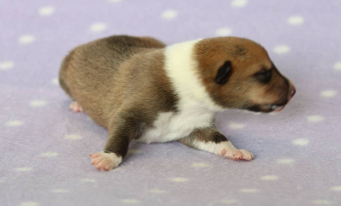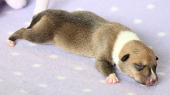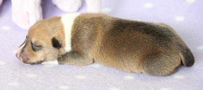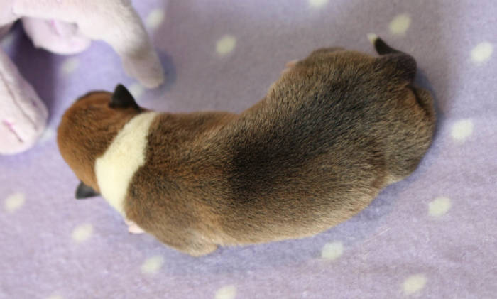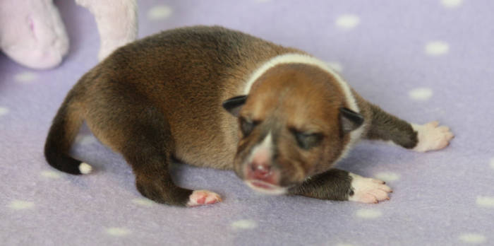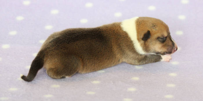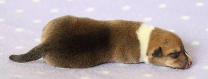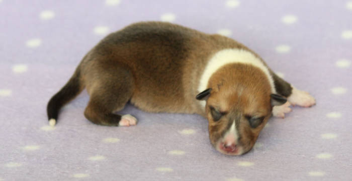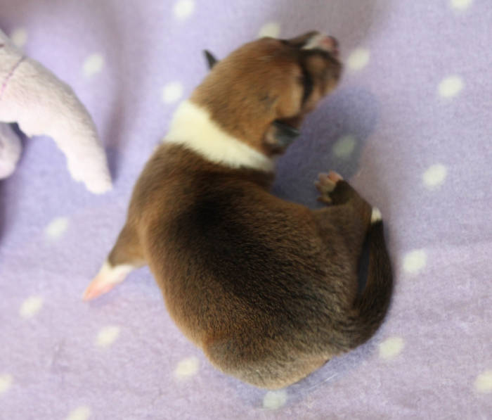 Er ist sehr ruhig und schläft noch viel und nimmt sehr gut an Gewicht zu. Obwohl er kleiner wirkt als sein Brüderchen, hat er diesen im Gewicht überholt. Dennoch ist er im Rücken etwas kürzer als die anderen und wird vermutlich ein wenig kleiner als diese bleiben. Er ist einfach etwas rundlicher als seine Geschwister.