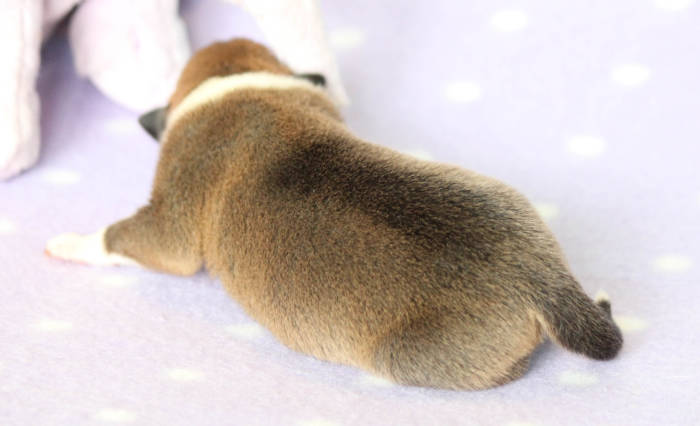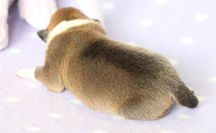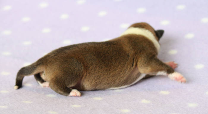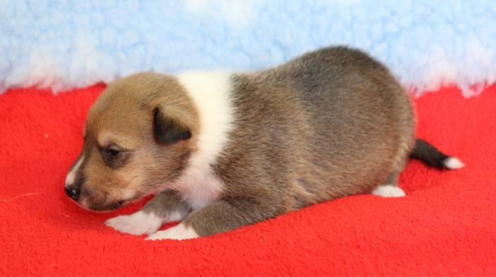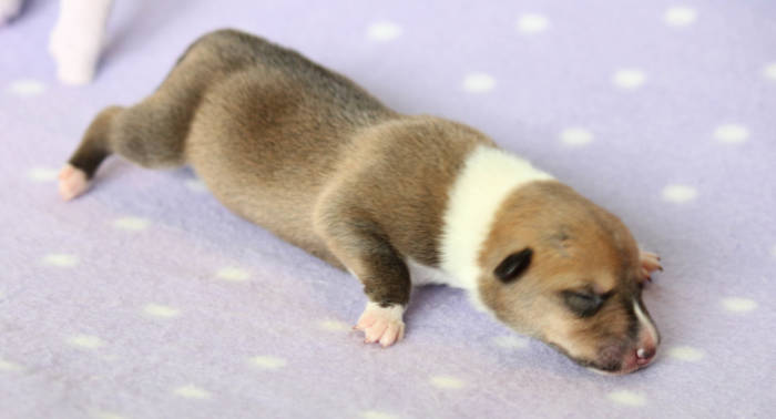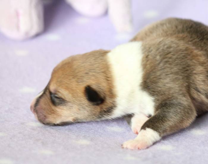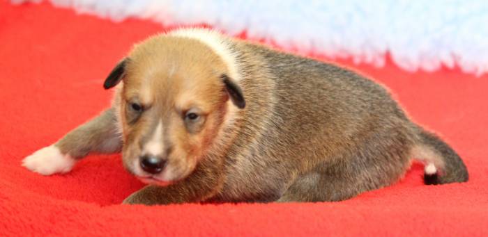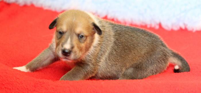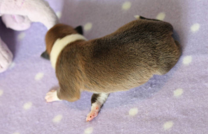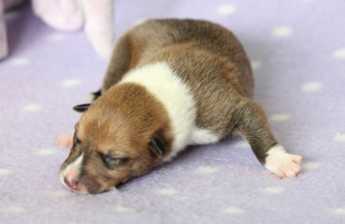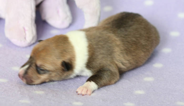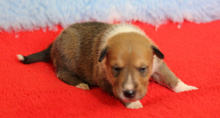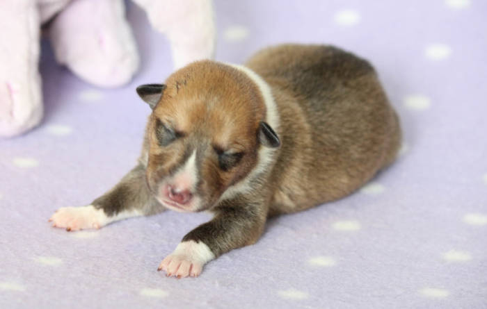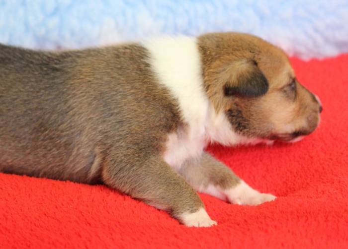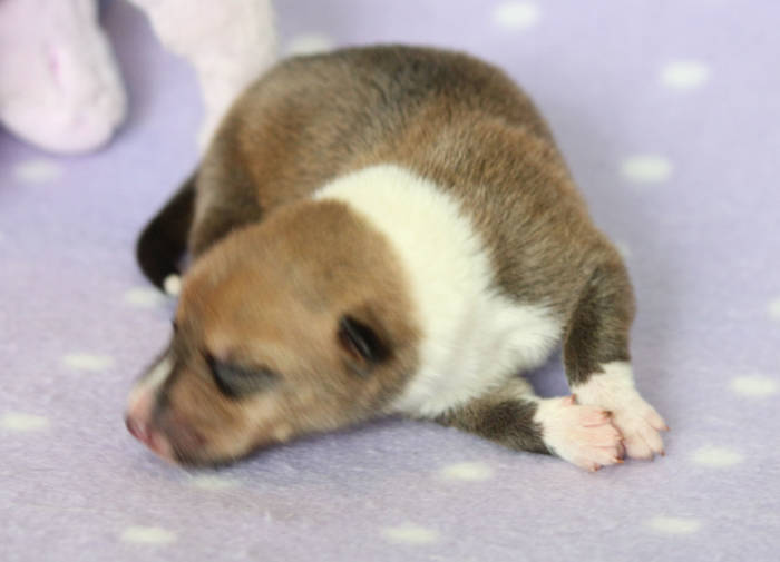 Er ist sehr ruhig und schläft noch viel und nimmt sehr gut an Gewicht zu. Obwohl er kleiner wirkt als sein Brüderchen, hat er diesen im Gewicht überholt. Dennoch ist er im Rücken etwas kürzer als die anderen und wird vermutlich ein wenig kleiner als diese bleiben. Er ist einfach etwas rundlicher als seine Geschwister.