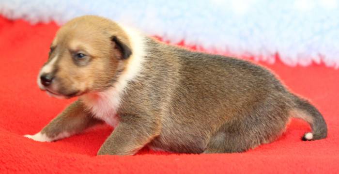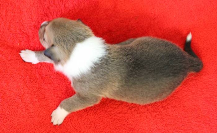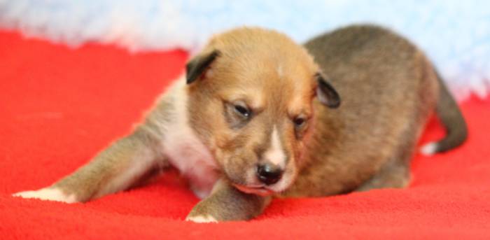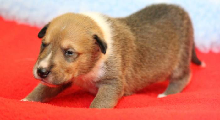Auch Bienes Wurf ist ausgesprochen problemlos und macht uns viel Freude. Sie brauchen keinerlei Unterstützung beim Trinken und liegen mit ihren Gewichten ziemlich nah beieinander. Obwohl Papa Dusty sehr viel Weißanteil hat, schlagen die Kinder eher in das Dunklere von ihrer Mama. Ein Rüde hat Blesse und keinen Kragen, der andere wiederum Kragen und keine Blesse und die blue-merle Hündin hat beides. Auffallend sind bei allen Dreien die schönen langen Ruten.