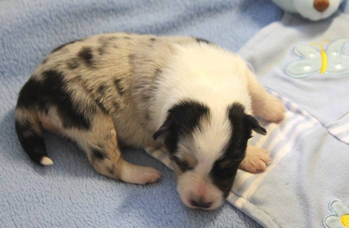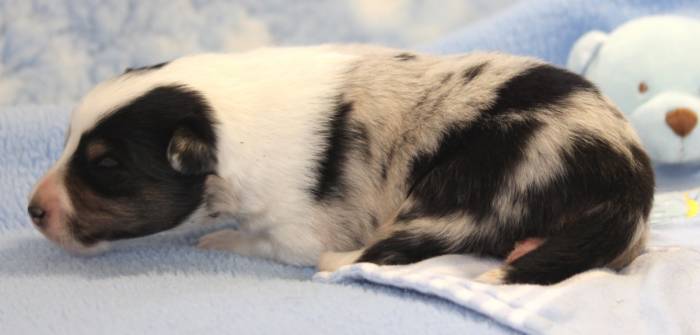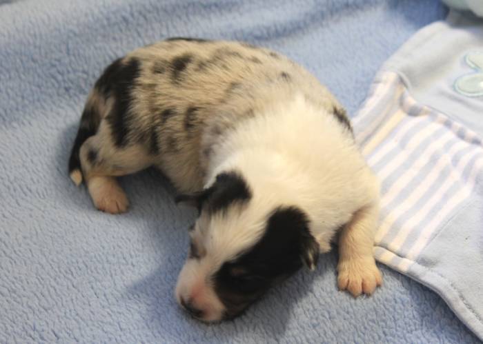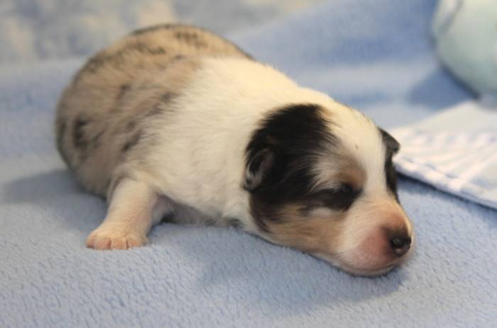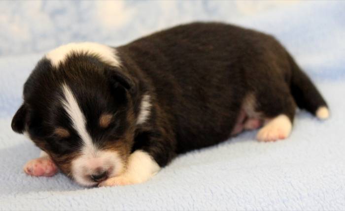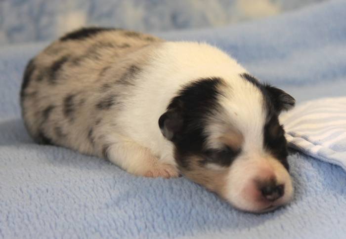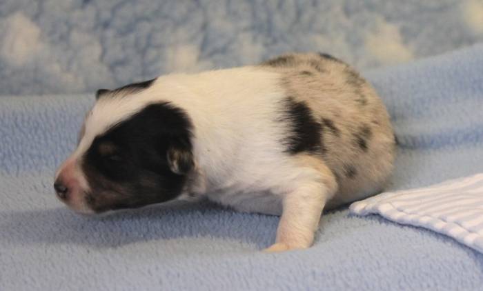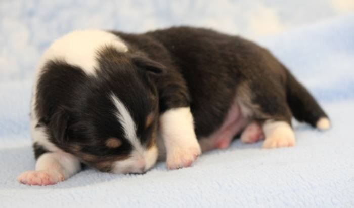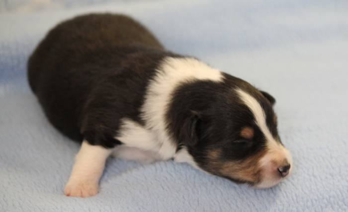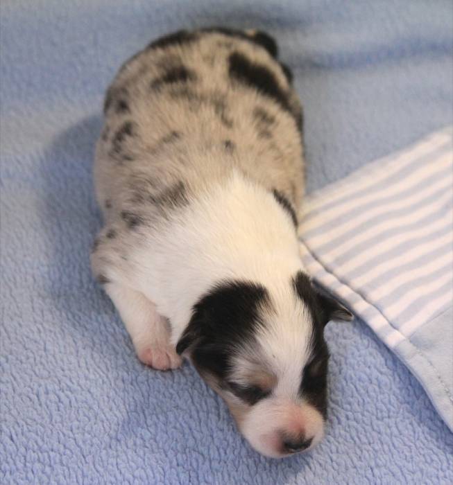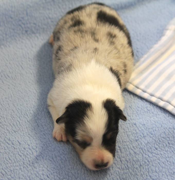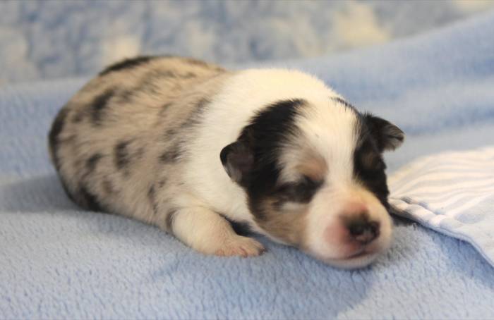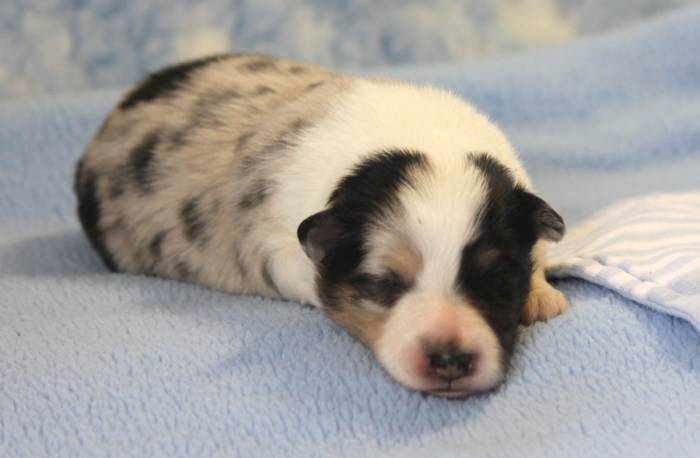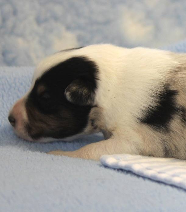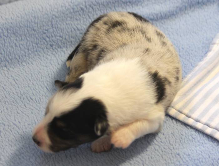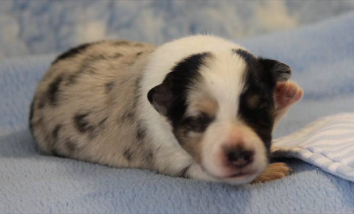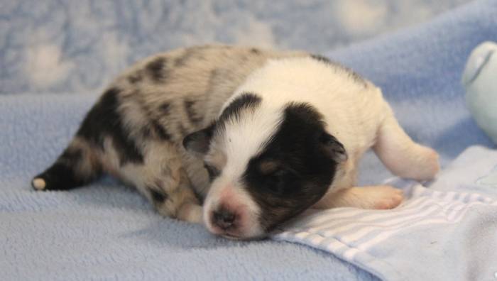 Eine Woche später, am 06.04.2018 hat unsere Josie ihre ersten Babys bekommen. Sie war sehr aufgeregt und ist auch jetzt noch ganz besorgt um ihre Kinder. Nimmt man eins zum Wiegen etc. kurz weg, will sie es sofort wiederhaben. Geboren wurden sogar 4 Welpen. Eine schöne tricolour Hündin wog bei der Geburt leider nur 90g. Sie hat es trotz aller Unterstützung nicht geschafft und ist am 2. Tag einfach friedlich und ruhig eingeschlafen. Wir waren alle sehr traurig, aber vermutlich war sie nicht ausgereift genug. Die restlichen drei, zwei tricolour Jungen und ein blue-merle Mädchen, nehmen prima zu und sind mittlerweile richtig kleine Speckmäuse 🙂