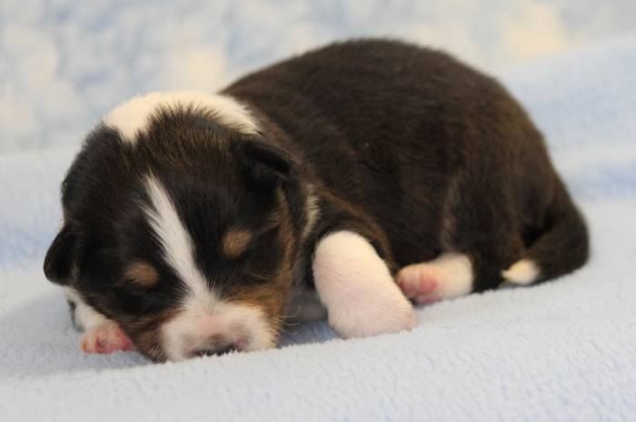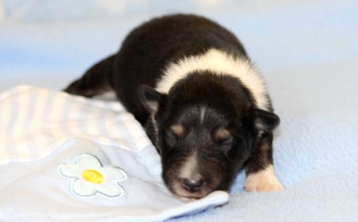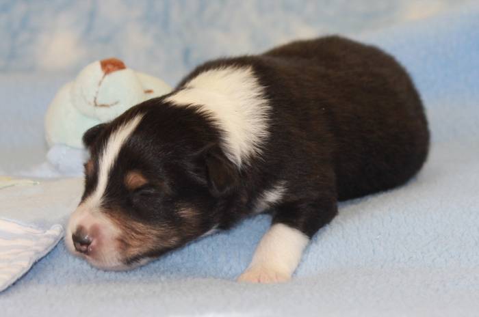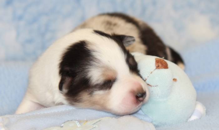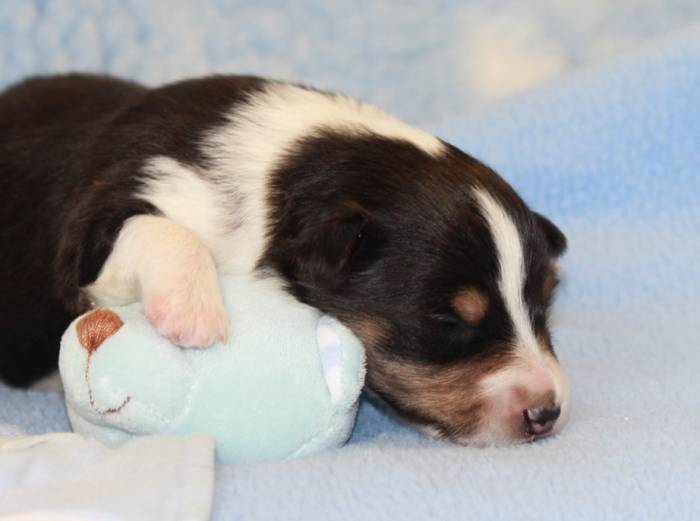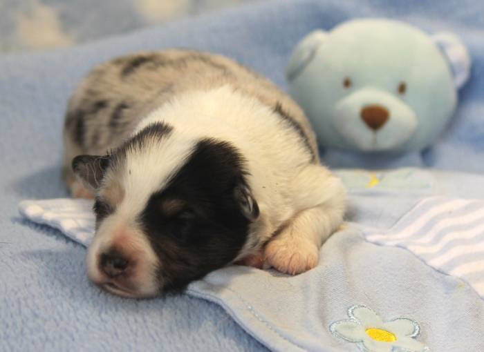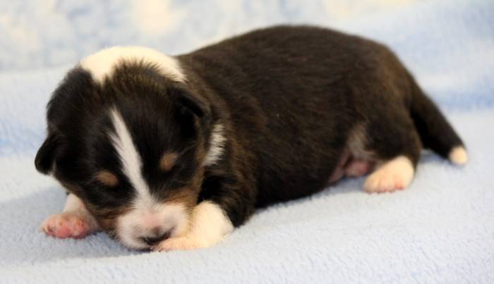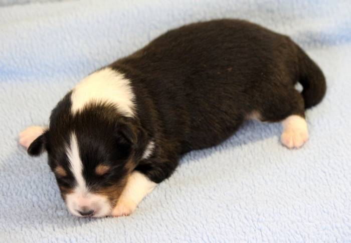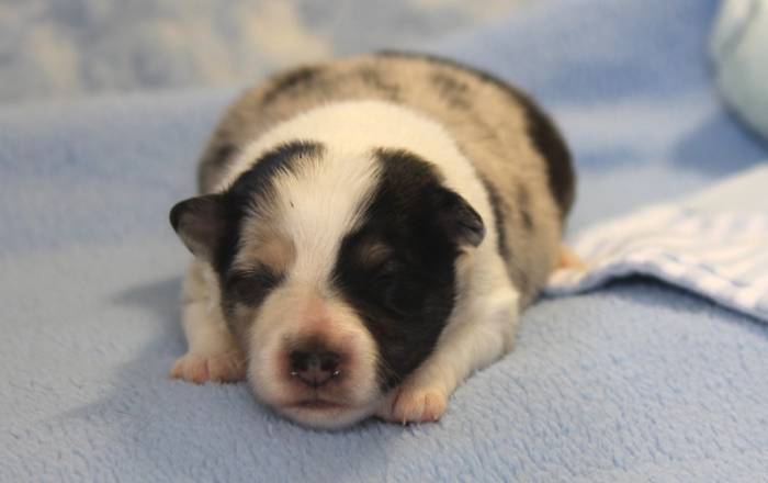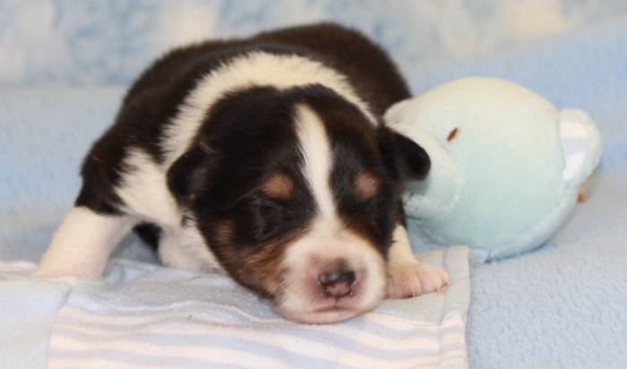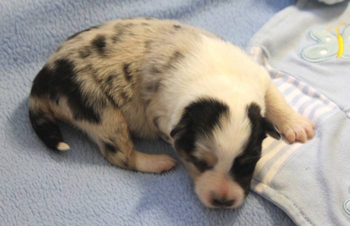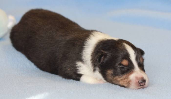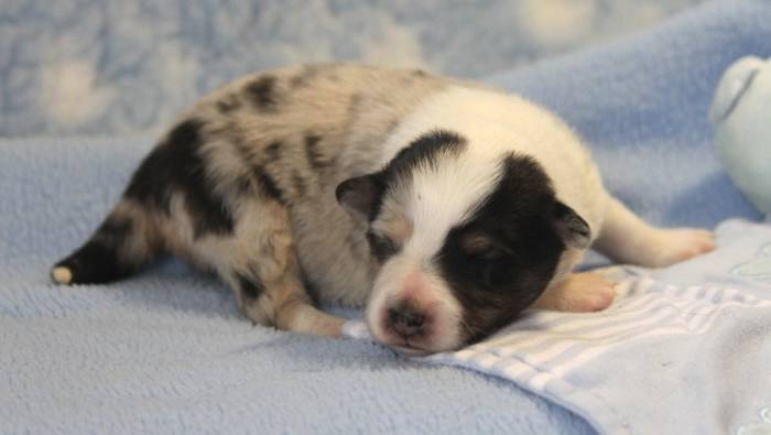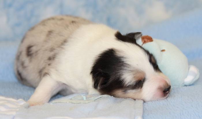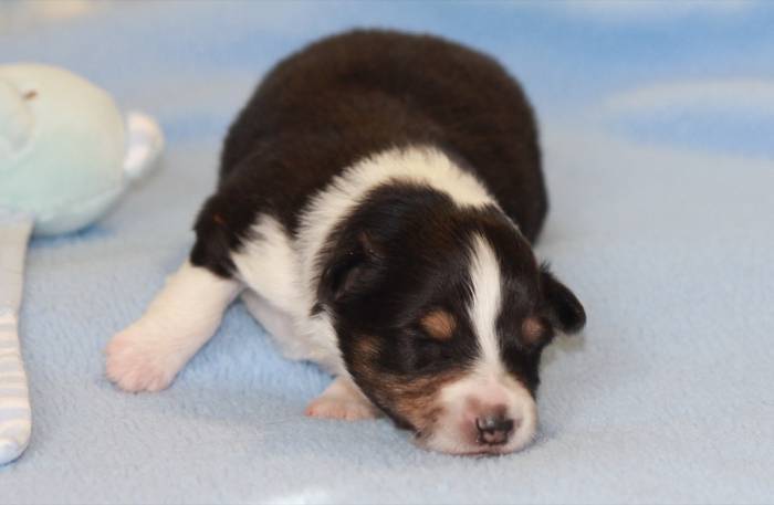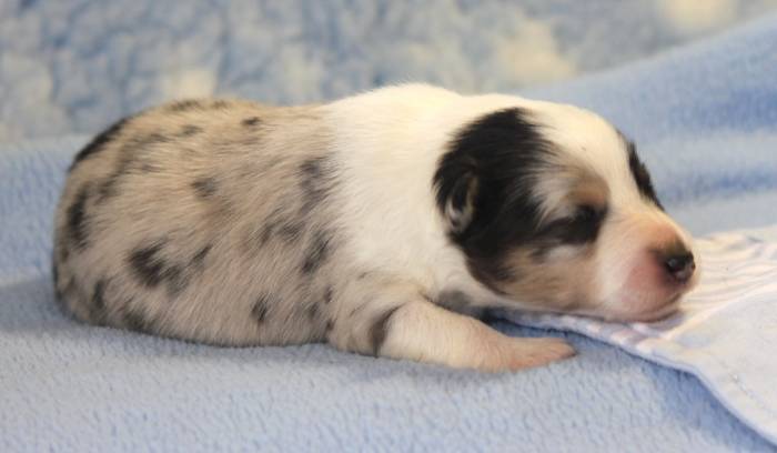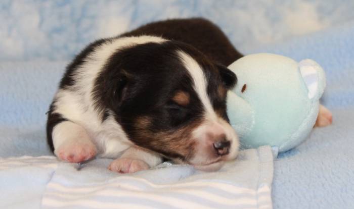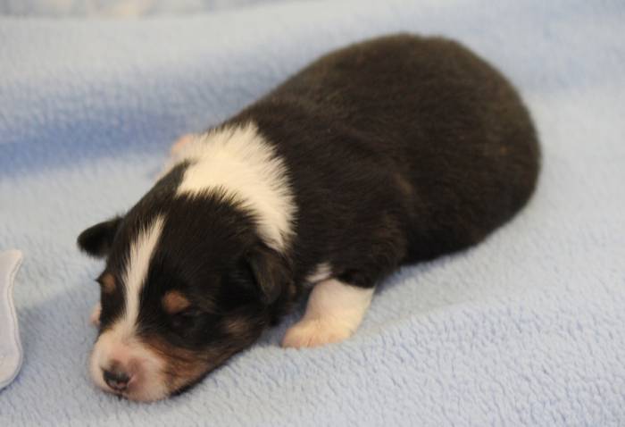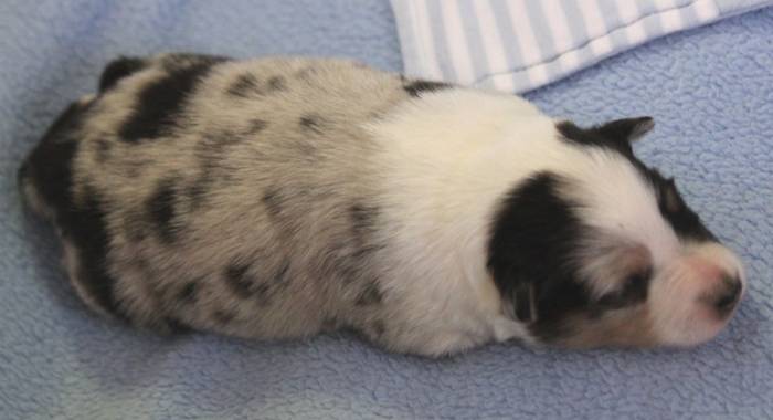 Eine Woche später, am 06.04.2018 hat unsere Josie ihre ersten Babys bekommen. Sie war sehr aufgeregt und ist auch jetzt noch ganz besorgt um ihre Kinder. Nimmt man eins zum Wiegen etc. kurz weg, will sie es sofort wiederhaben. Geboren wurden sogar 4 Welpen. Eine schöne tricolour Hündin wog bei der Geburt leider nur 90g. Sie hat es trotz aller Unterstützung nicht geschafft und ist am 2. Tag einfach friedlich und ruhig eingeschlafen. Wir waren alle sehr traurig, aber vermutlich war sie nicht ausgereift genug. Die restlichen drei, zwei tricolour Jungen und ein blue-merle Mädchen, nehmen prima zu und sind mittlerweile richtig kleine Speckmäuse 🙂