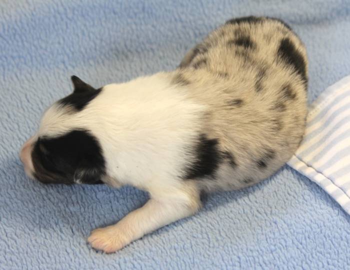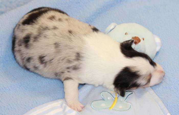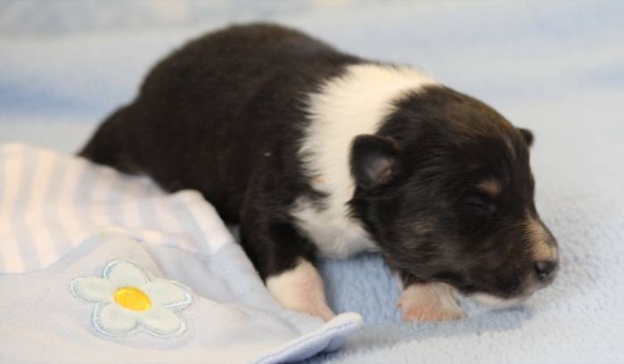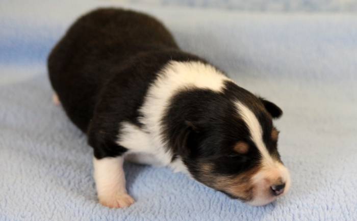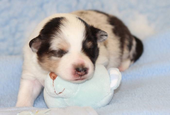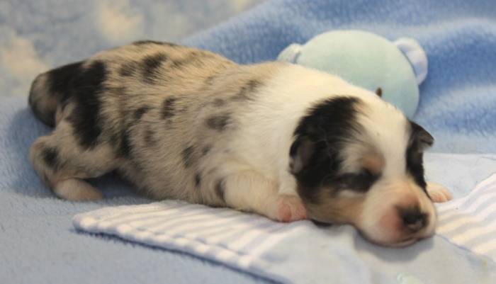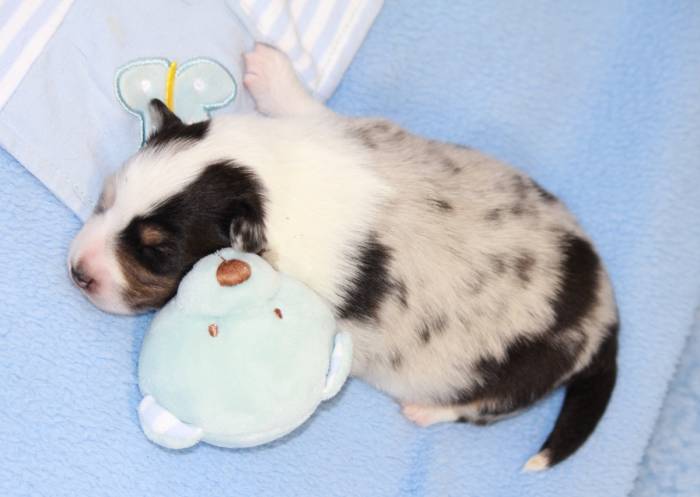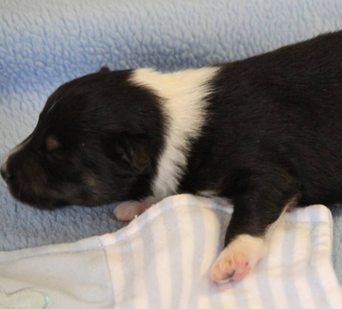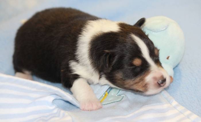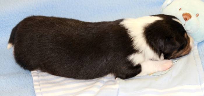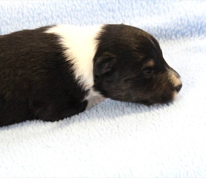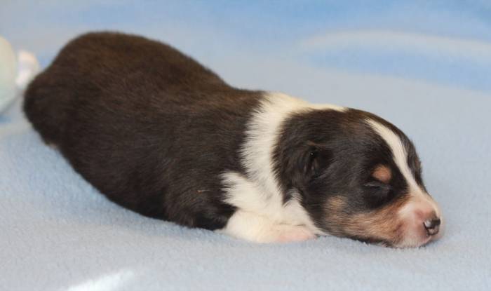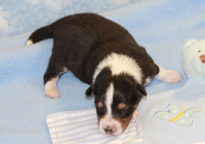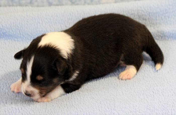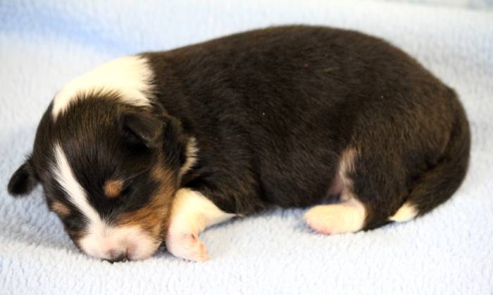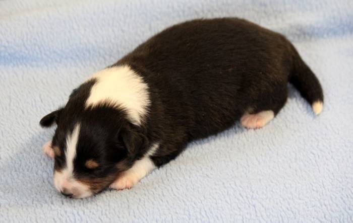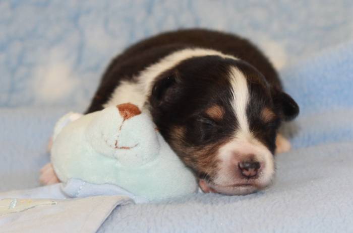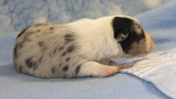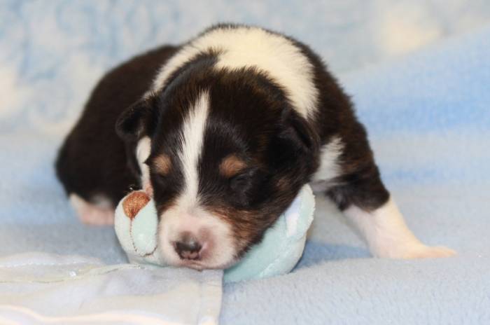 Eine Woche später, am 06.04.2018 hat unsere Josie ihre ersten Babys bekommen. Sie war sehr aufgeregt und ist auch jetzt noch ganz besorgt um ihre Kinder. Nimmt man eins zum Wiegen etc. kurz weg, will sie es sofort wiederhaben. Geboren wurden sogar 4 Welpen. Eine schöne tricolour Hündin wog bei der Geburt leider nur 90g. Sie hat es trotz aller Unterstützung nicht geschafft und ist am 2. Tag einfach friedlich und ruhig eingeschlafen. Wir waren alle sehr traurig, aber vermutlich war sie nicht ausgereift genug. Die restlichen drei, zwei tricolour Jungen und ein blue-merle Mädchen, nehmen prima zu und sind mittlerweile richtig kleine Speckmäuse 🙂