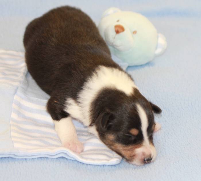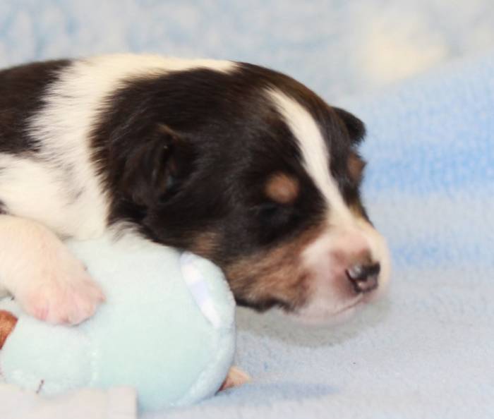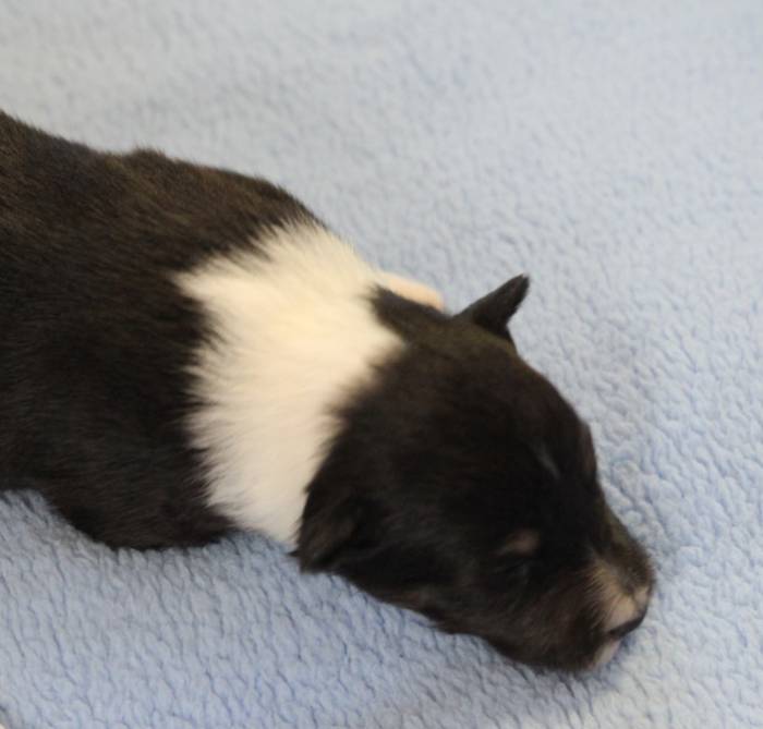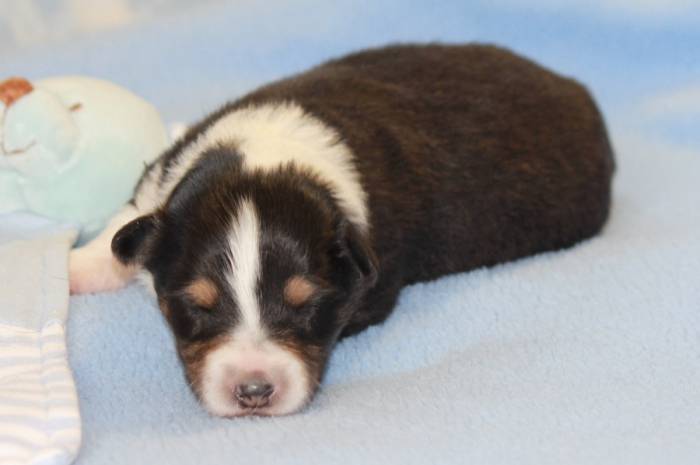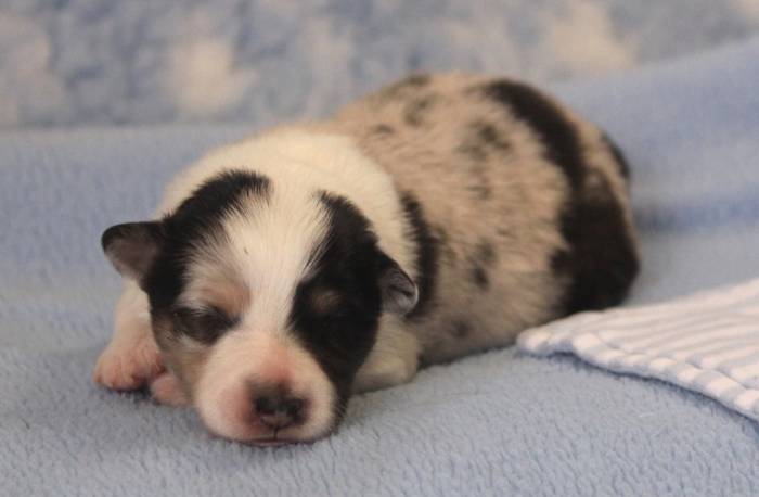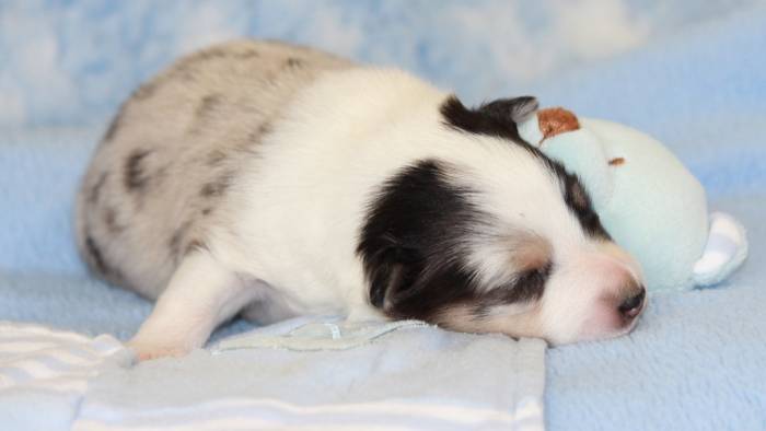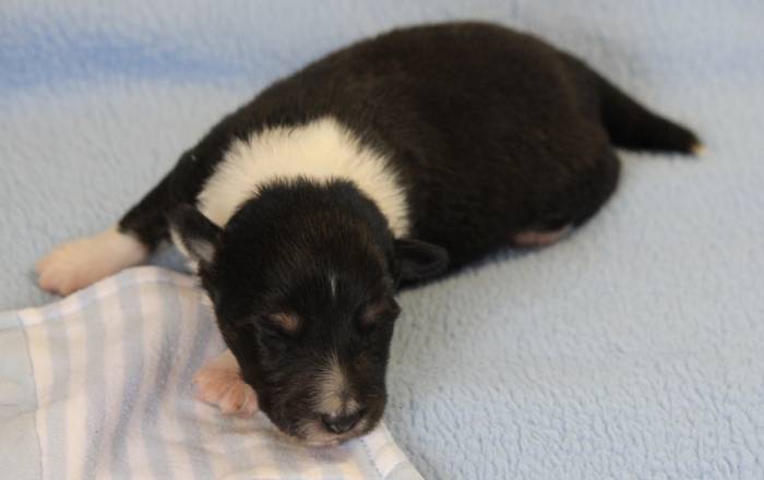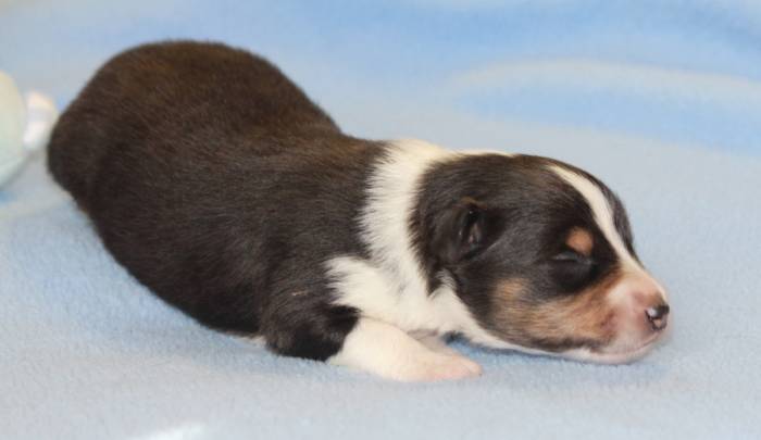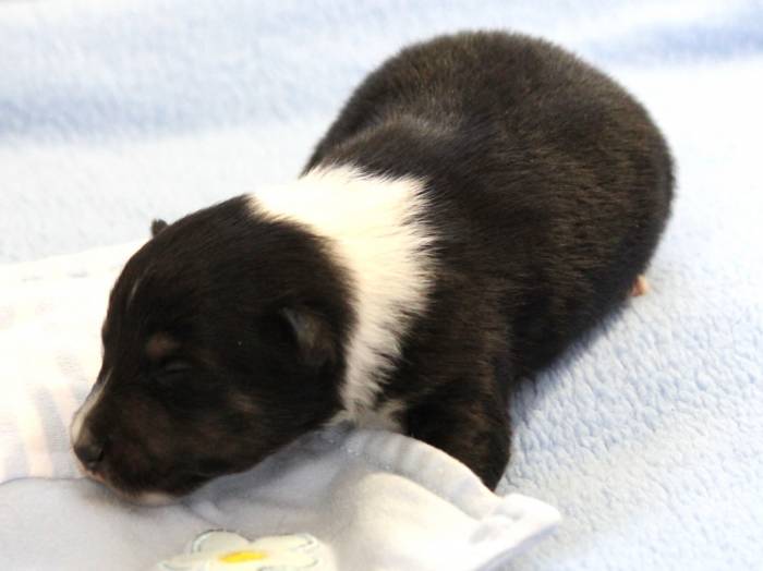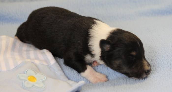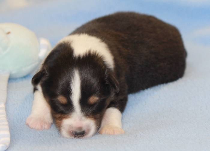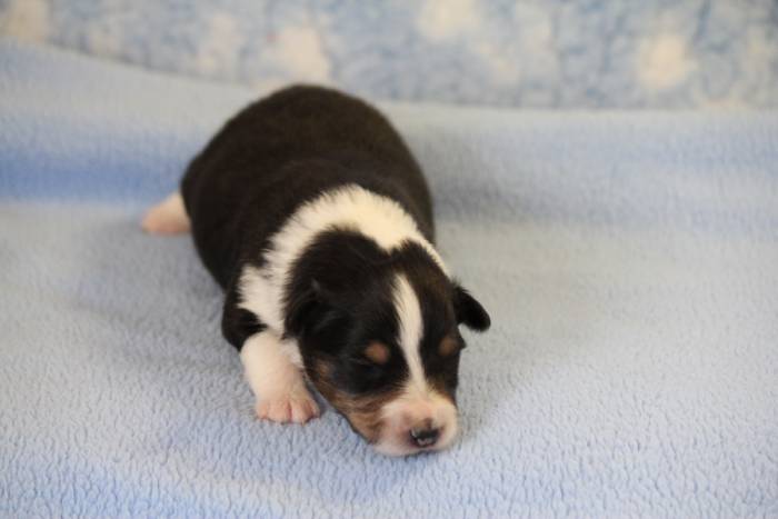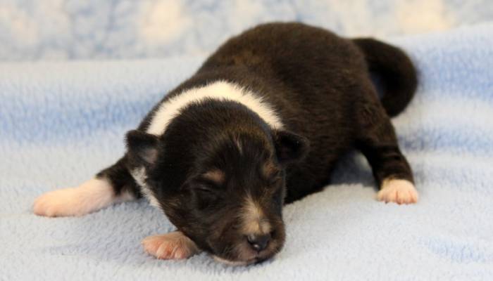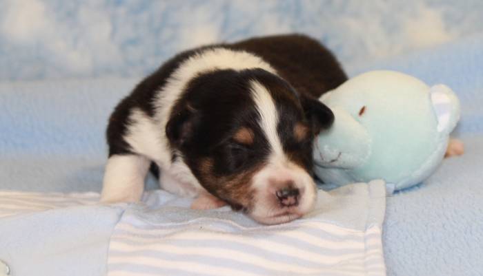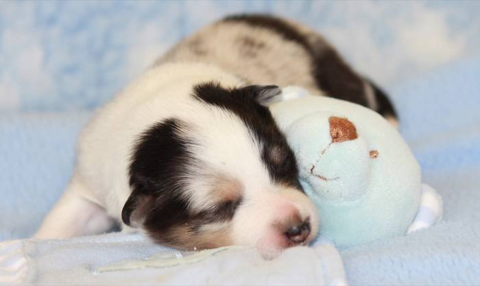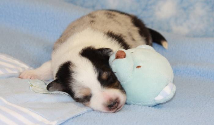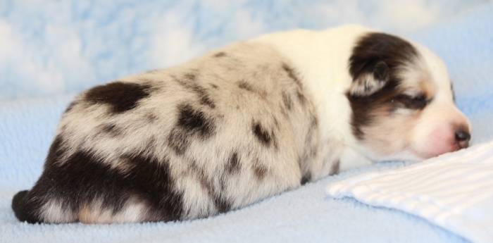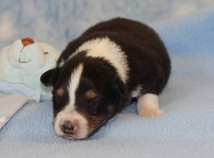 Eine Woche später, am 06.04.2018 hat unsere Josie ihre ersten Babys bekommen. Sie war sehr aufgeregt und ist auch jetzt noch ganz besorgt um ihre Kinder. Nimmt man eins zum Wiegen etc. kurz weg, will sie es sofort wiederhaben. Geboren wurden sogar 4 Welpen. Eine schöne tricolour Hündin wog bei der Geburt leider nur 90g. Sie hat es trotz aller Unterstützung nicht geschafft und ist am 2. Tag einfach friedlich und ruhig eingeschlafen. Wir waren alle sehr traurig, aber vermutlich war sie nicht ausgereift genug. Die restlichen drei, zwei tricolour Jungen und ein blue-merle Mädchen, nehmen prima zu und sind mittlerweile richtig kleine Speckmäuse 🙂