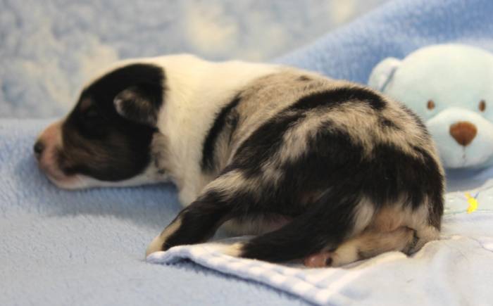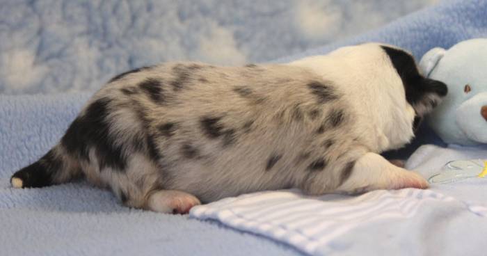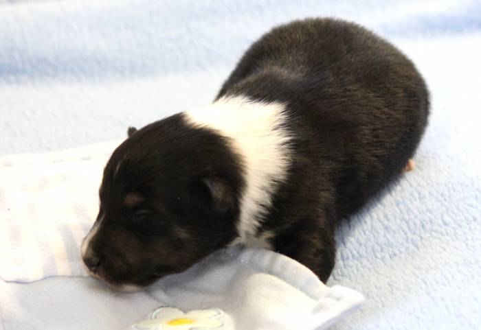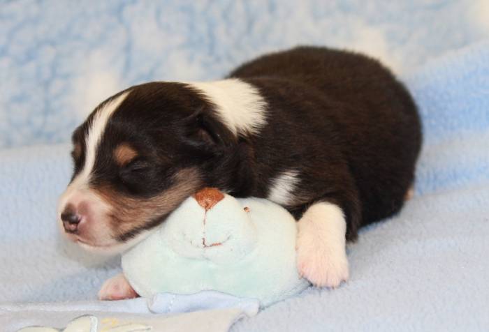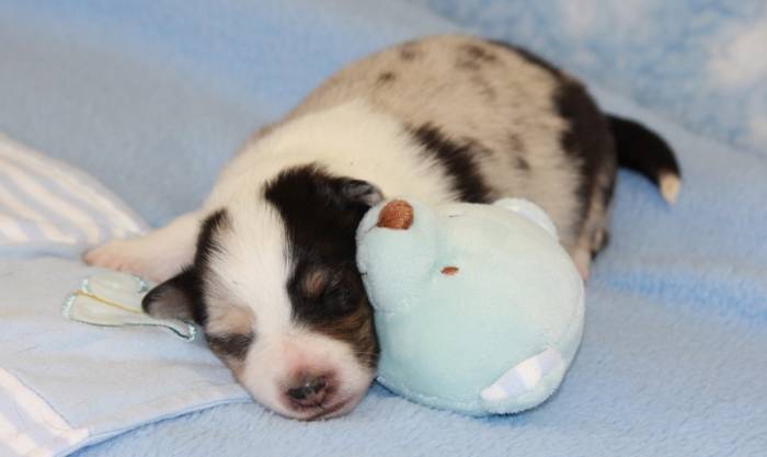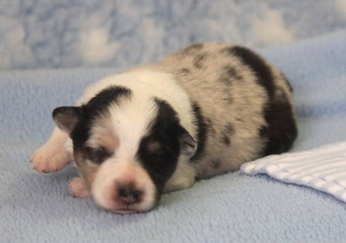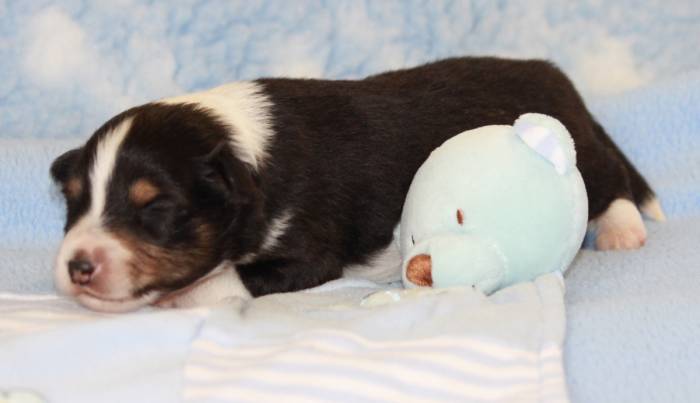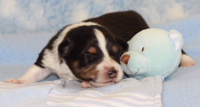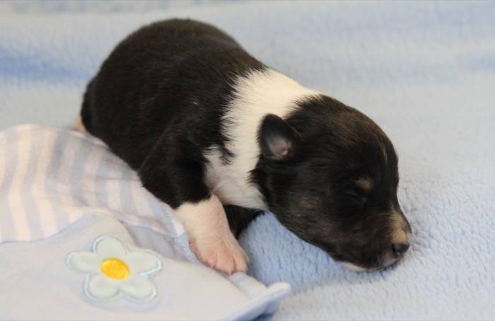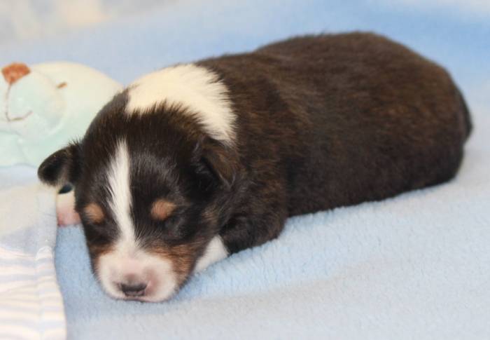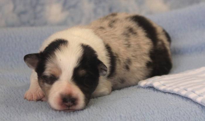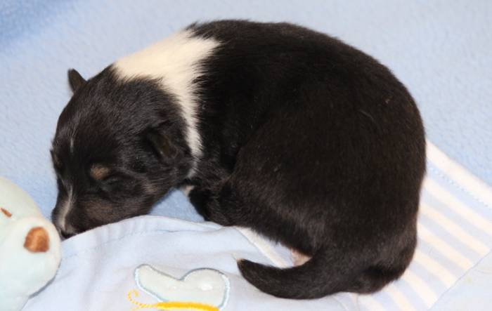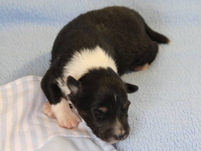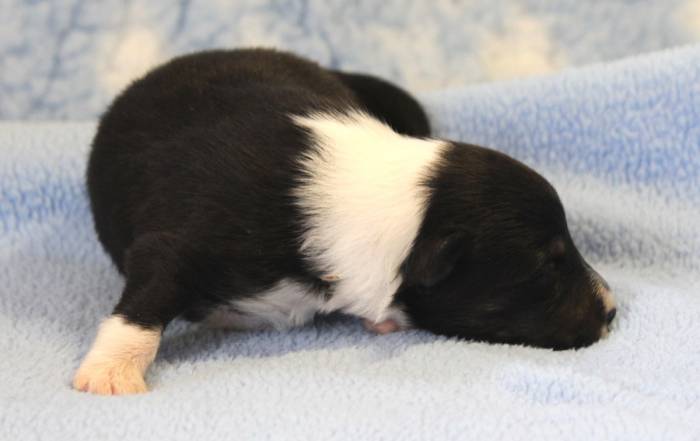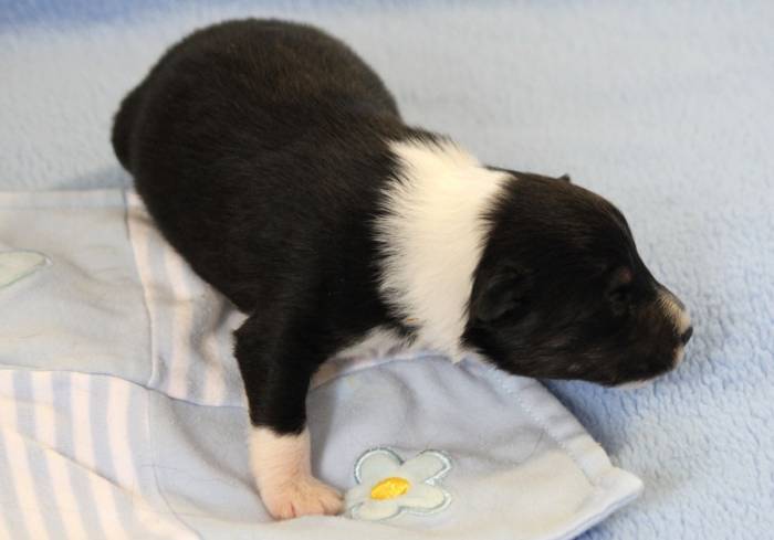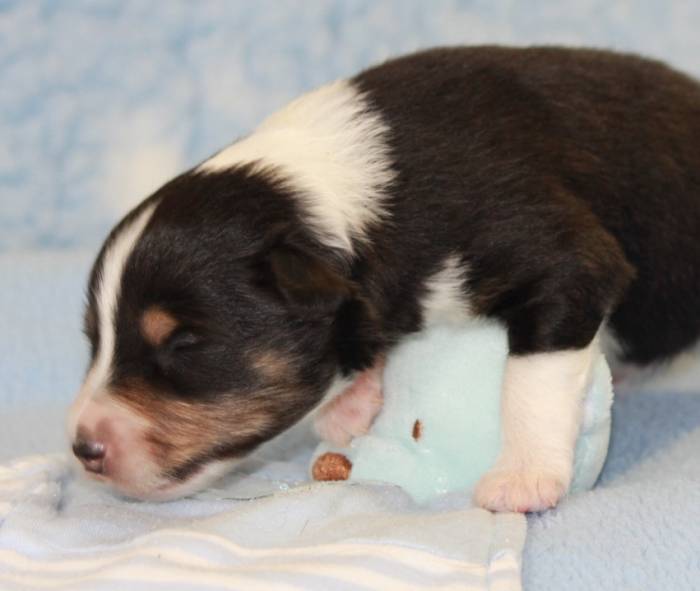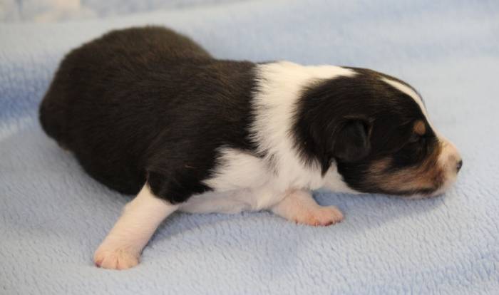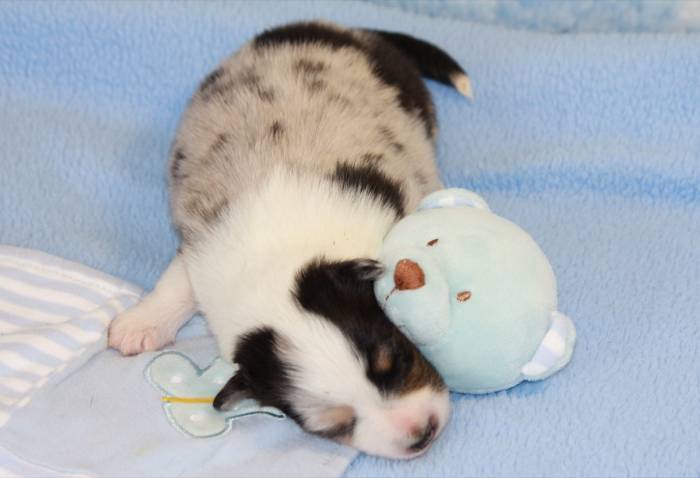 Eine Woche später, am 06.04.2018 hat unsere Josie ihre ersten Babys bekommen. Sie war sehr aufgeregt und ist auch jetzt noch ganz besorgt um ihre Kinder. Nimmt man eins zum Wiegen etc. kurz weg, will sie es sofort wiederhaben. Geboren wurden sogar 4 Welpen. Eine schöne tricolour Hündin wog bei der Geburt leider nur 90g. Sie hat es trotz aller Unterstützung nicht geschafft und ist am 2. Tag einfach friedlich und ruhig eingeschlafen. Wir waren alle sehr traurig, aber vermutlich war sie nicht ausgereift genug. Die restlichen drei, zwei tricolour Jungen und ein blue-merle Mädchen, nehmen prima zu und sind mittlerweile richtig kleine Speckmäuse 🙂