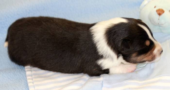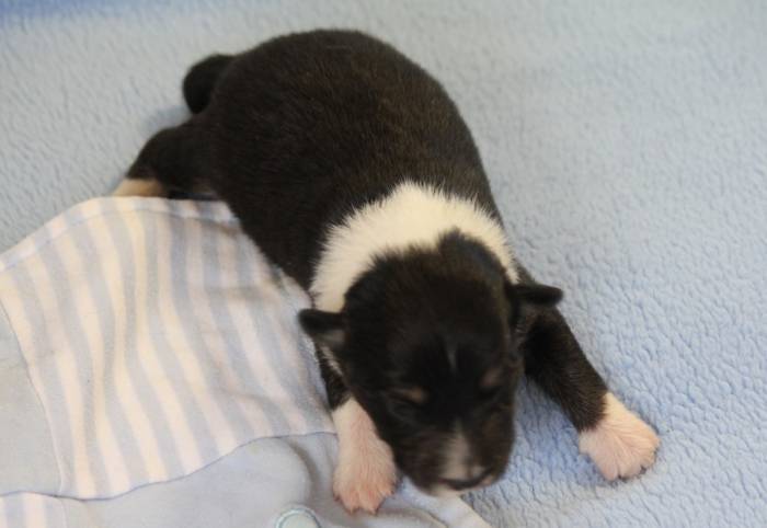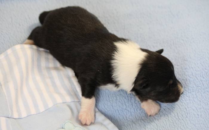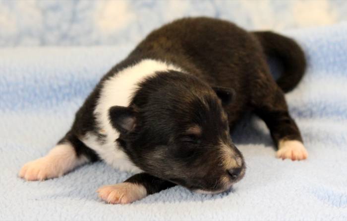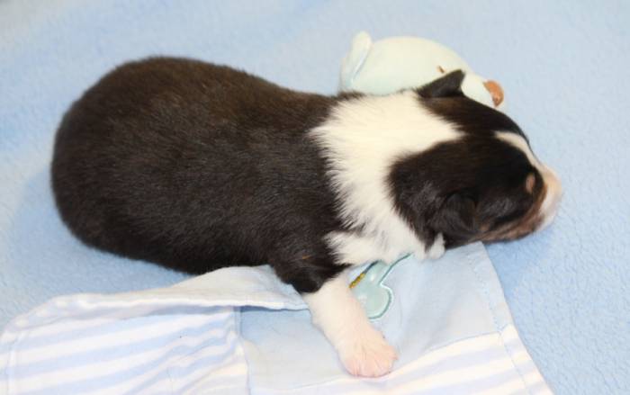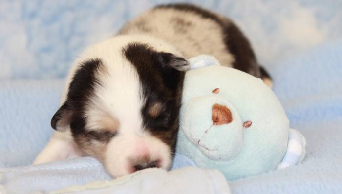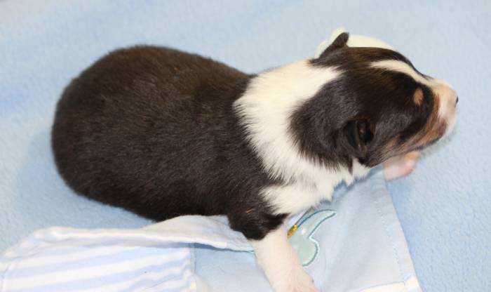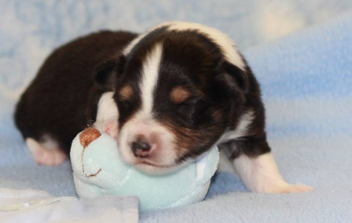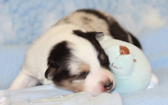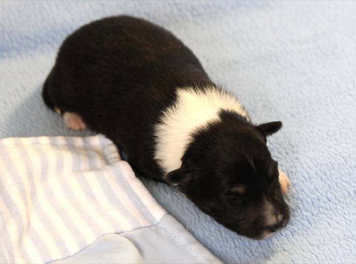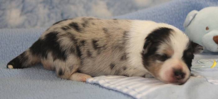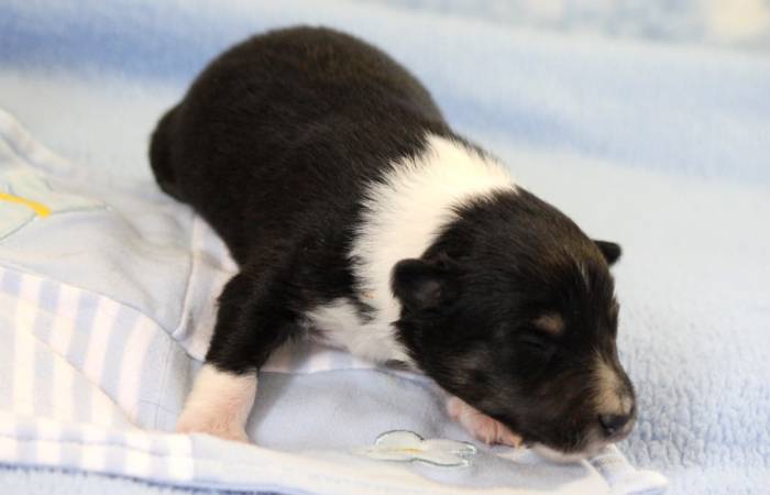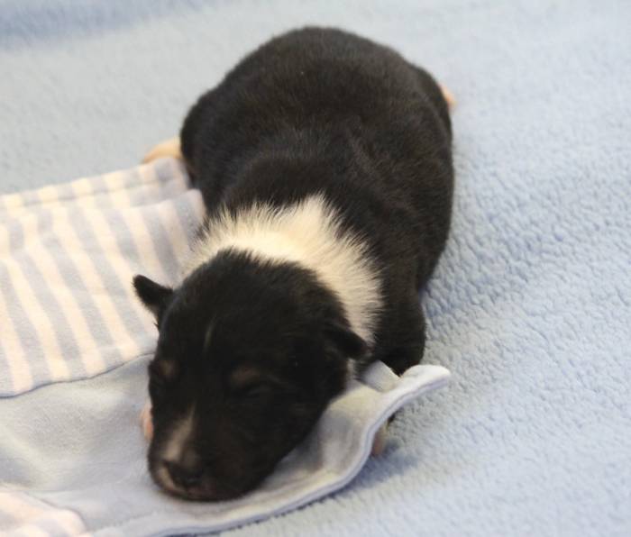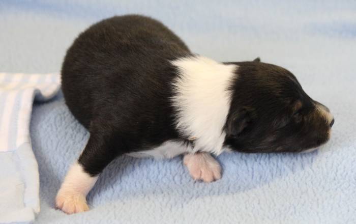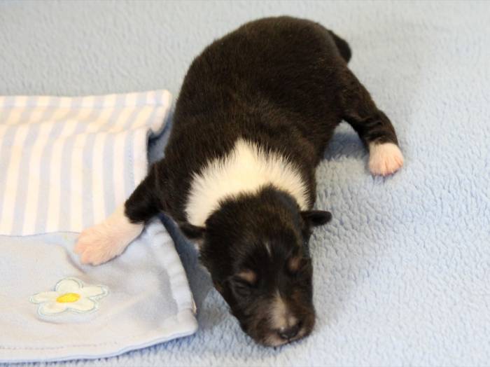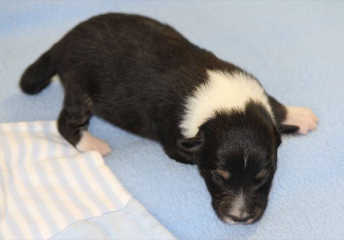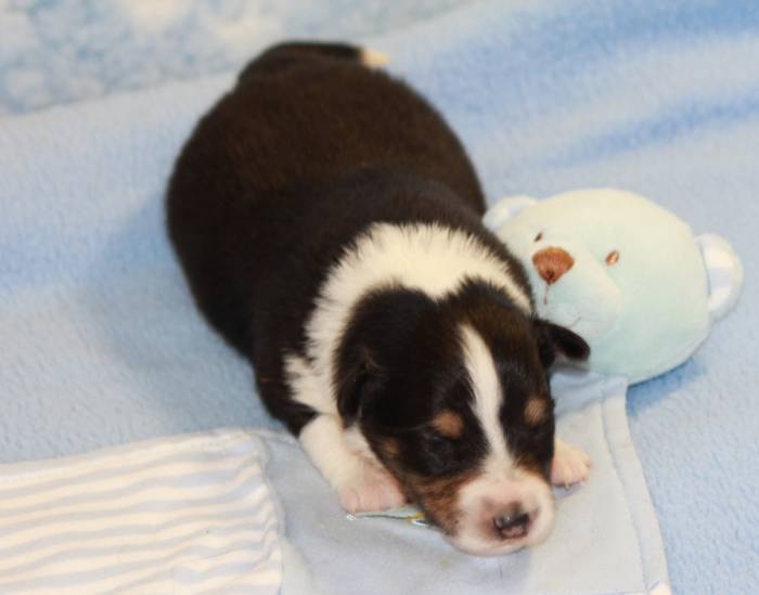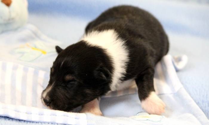 Eine Woche später, am 06.04.2018 hat unsere Josie ihre ersten Babys bekommen. Sie war sehr aufgeregt und ist auch jetzt noch ganz besorgt um ihre Kinder. Nimmt man eins zum Wiegen etc. kurz weg, will sie es sofort wiederhaben. Geboren wurden sogar 4 Welpen. Eine schöne tricolour Hündin wog bei der Geburt leider nur 90g. Sie hat es trotz aller Unterstützung nicht geschafft und ist am 2. Tag einfach friedlich und ruhig eingeschlafen. Wir waren alle sehr traurig, aber vermutlich war sie nicht ausgereift genug. Die restlichen drei, zwei tricolour Jungen und ein blue-merle Mädchen, nehmen prima zu und sind mittlerweile richtig kleine Speckmäuse 🙂