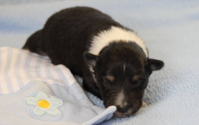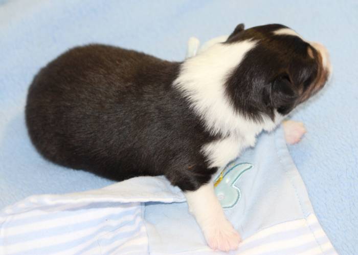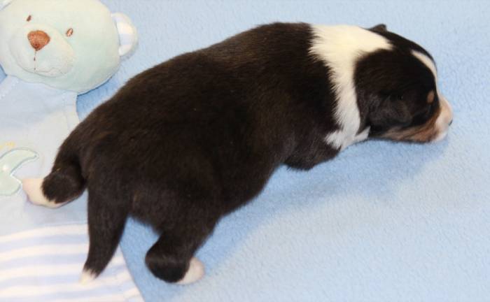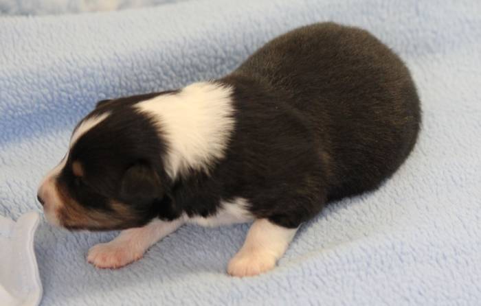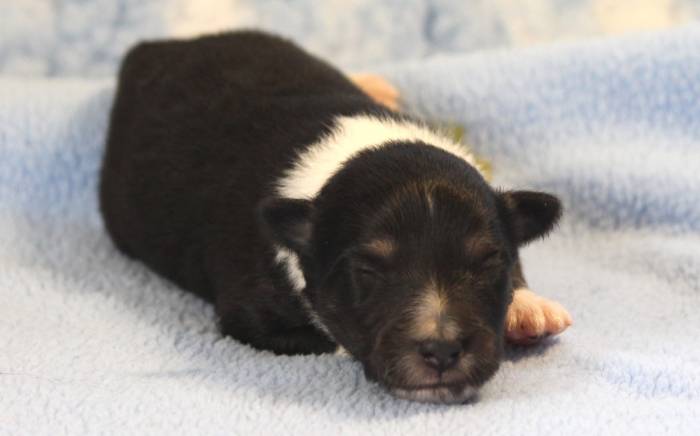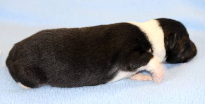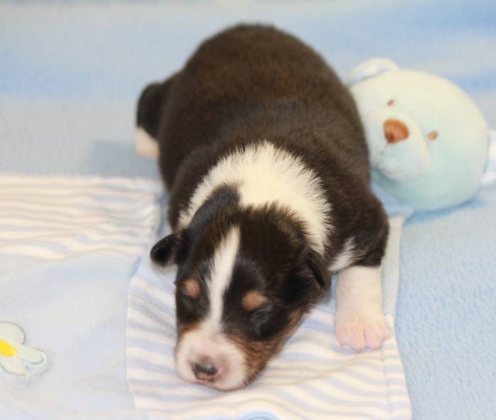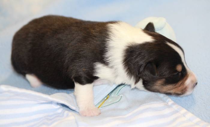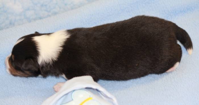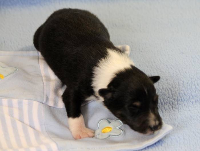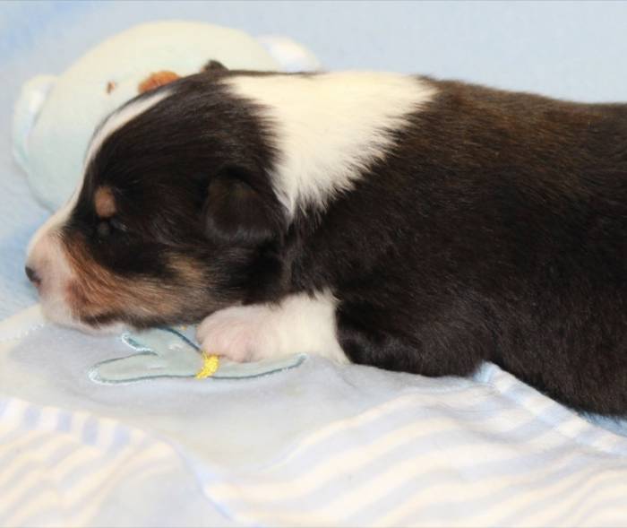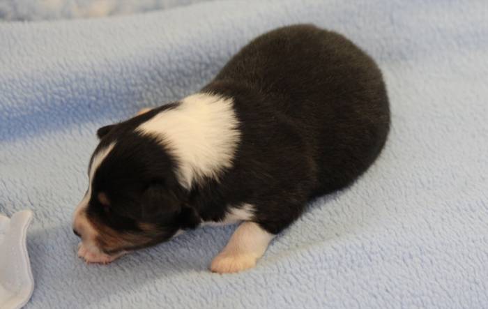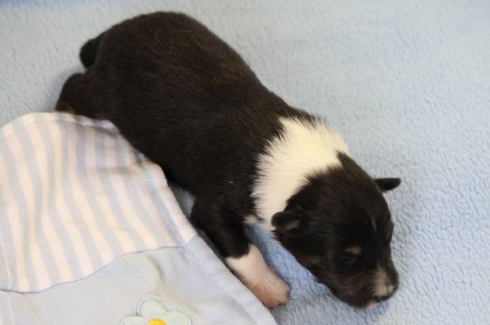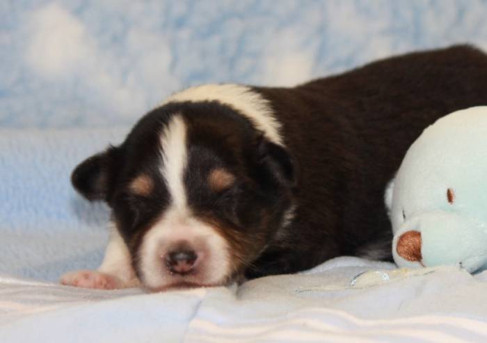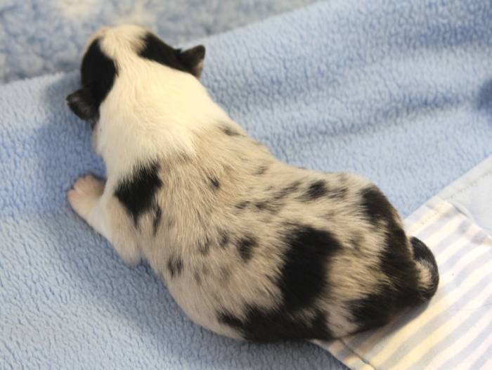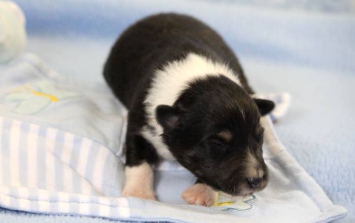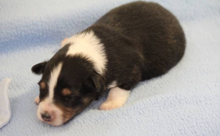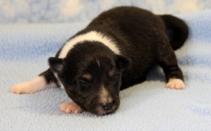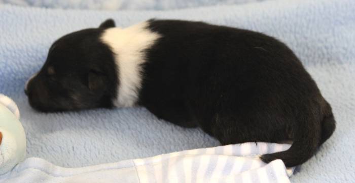 Eine Woche später, am 06.04.2018 hat unsere Josie ihre ersten Babys bekommen. Sie war sehr aufgeregt und ist auch jetzt noch ganz besorgt um ihre Kinder. Nimmt man eins zum Wiegen etc. kurz weg, will sie es sofort wiederhaben. Geboren wurden sogar 4 Welpen. Eine schöne tricolour Hündin wog bei der Geburt leider nur 90g. Sie hat es trotz aller Unterstützung nicht geschafft und ist am 2. Tag einfach friedlich und ruhig eingeschlafen. Wir waren alle sehr traurig, aber vermutlich war sie nicht ausgereift genug. Die restlichen drei, zwei tricolour Jungen und ein blue-merle Mädchen, nehmen prima zu und sind mittlerweile richtig kleine Speckmäuse 🙂