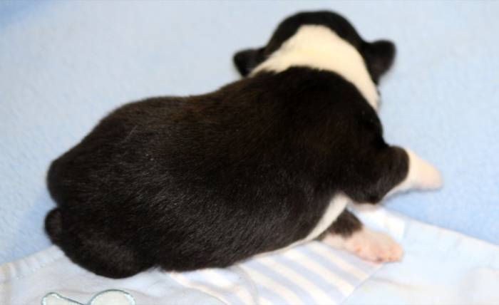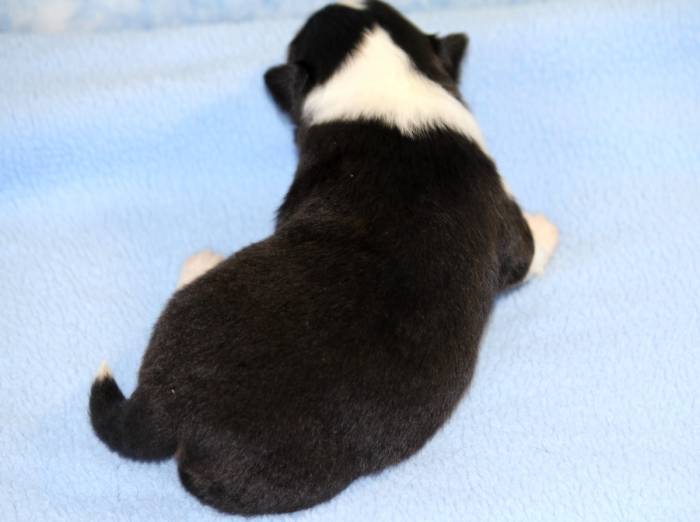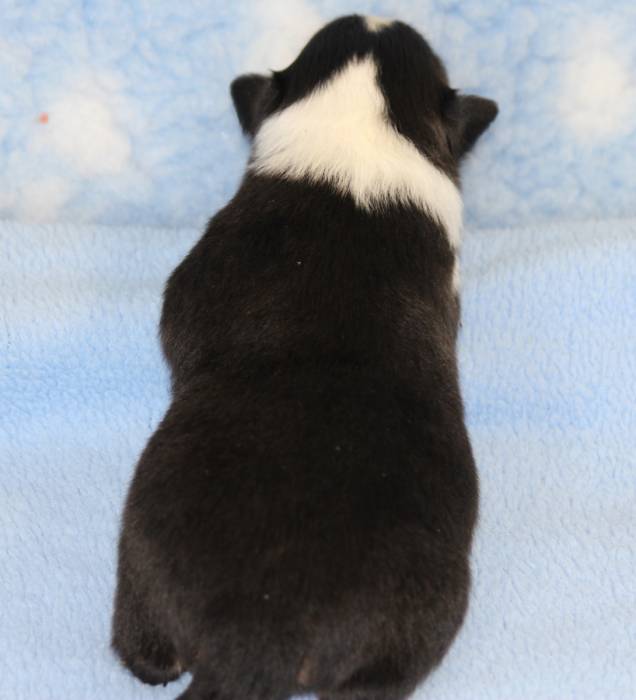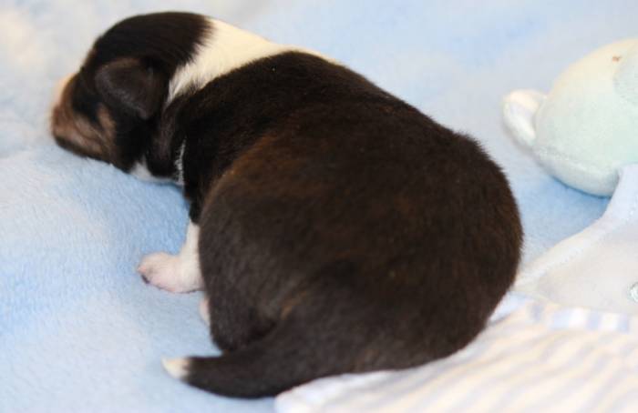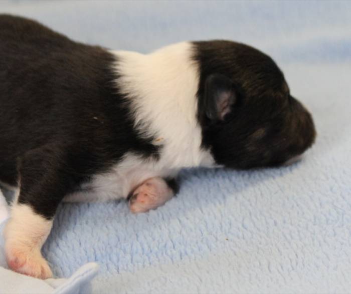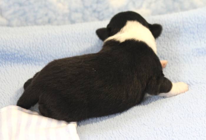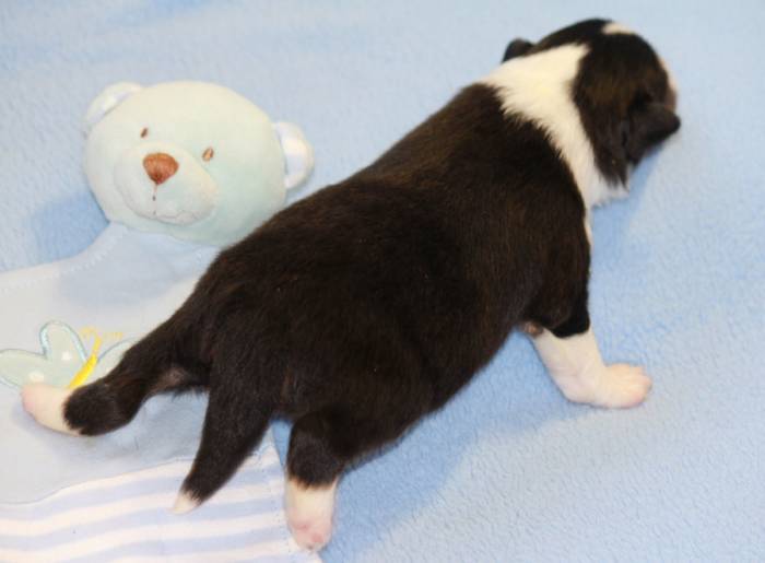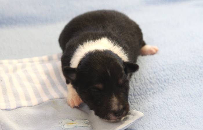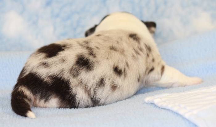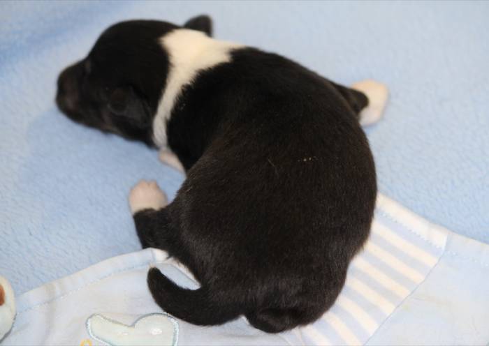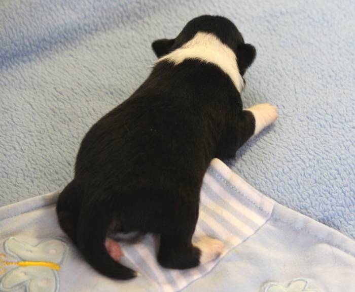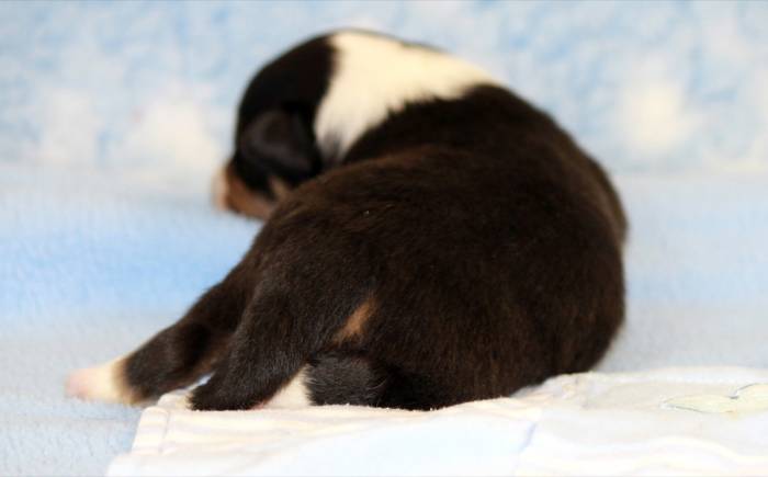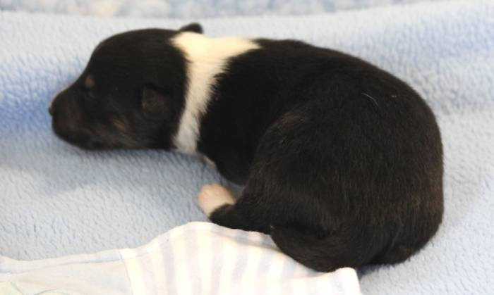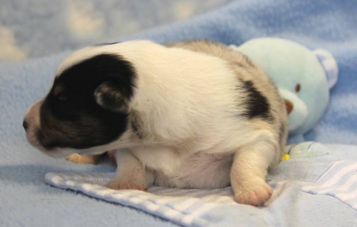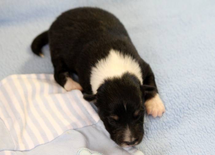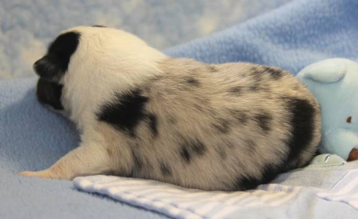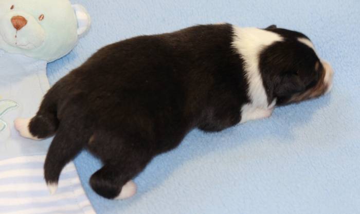 Eine Woche später, am 06.04.2018 hat unsere Josie ihre ersten Babys bekommen. Sie war sehr aufgeregt und ist auch jetzt noch ganz besorgt um ihre Kinder. Nimmt man eins zum Wiegen etc. kurz weg, will sie es sofort wiederhaben. Geboren wurden sogar 4 Welpen. Eine schöne tricolour Hündin wog bei der Geburt leider nur 90g. Sie hat es trotz aller Unterstützung nicht geschafft und ist am 2. Tag einfach friedlich und ruhig eingeschlafen. Wir waren alle sehr traurig, aber vermutlich war sie nicht ausgereift genug. Die restlichen drei, zwei tricolour Jungen und ein blue-merle Mädchen, nehmen prima zu und sind mittlerweile richtig kleine Speckmäuse 🙂